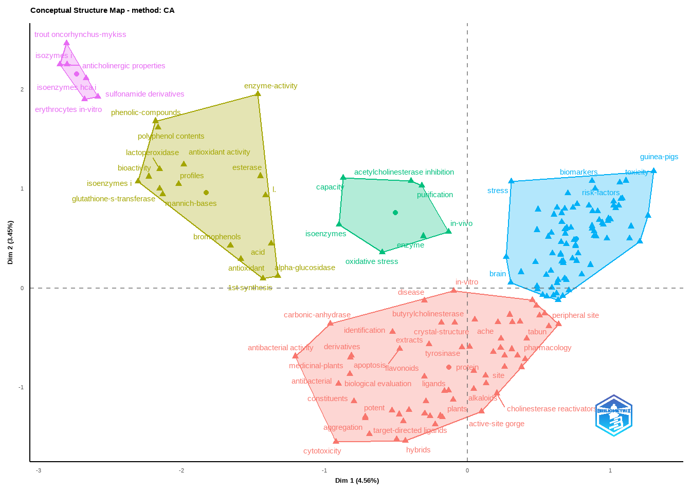 CS <- conceptualStructure(M1,field="ID", method="CA", minDegree=4, clust=5, stemming=FALSE, labelsize=10, documents=10)