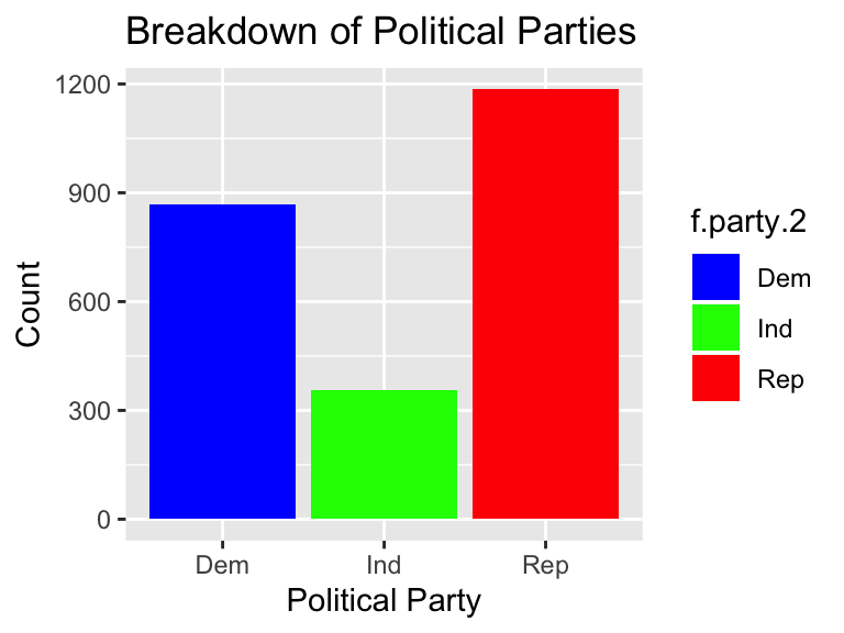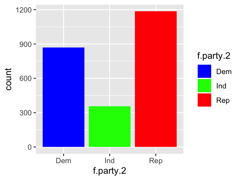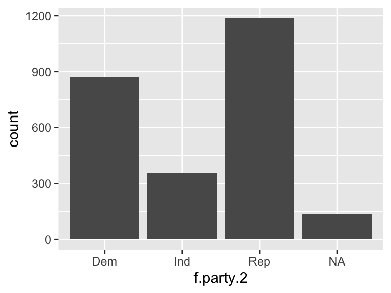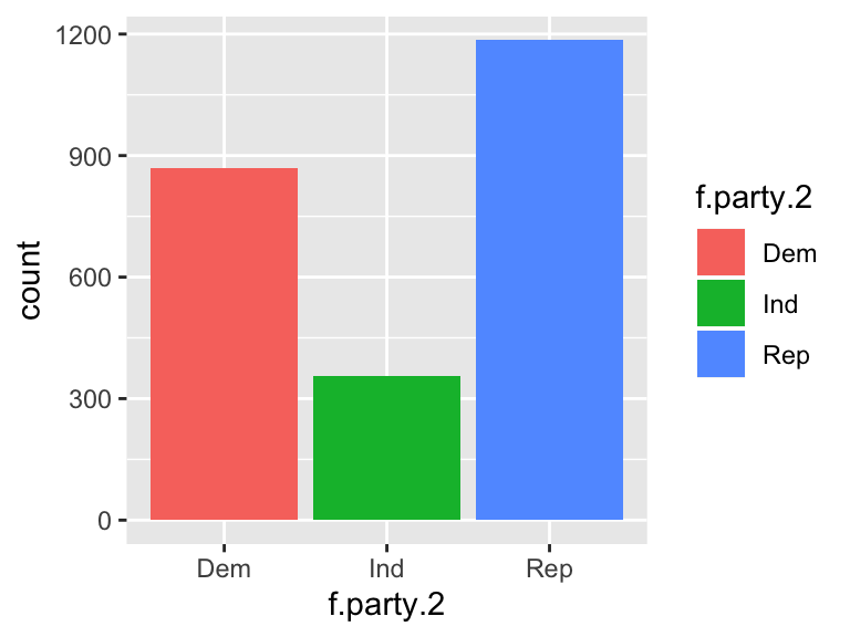 To create a visualization that only includes Democrats, Republicans, and Independents, use the drop_na function to filter out NAs, then pipe it to ggplot2 Color can also be included by specifying fill = f.party.2. Note that inlcuding the . in place of the data set argument works when you pipe a dataset into ggplot2. Doing so tells R to use the data that is being piped into ggplot2.