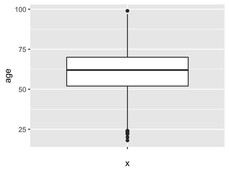 Last, a box plot can be generated via the boxplot() function. Technically a box plot in ggplot2 requires both an x and y value, so simply indiciate "" for the x portion of the aesthetic.