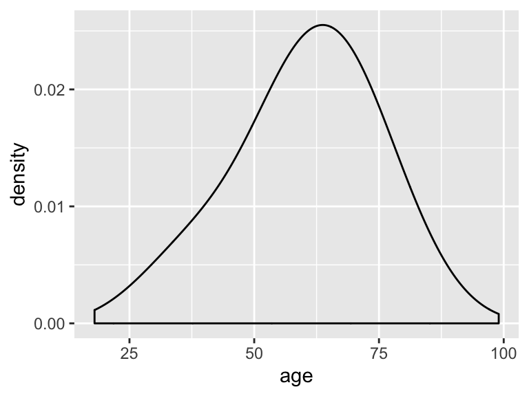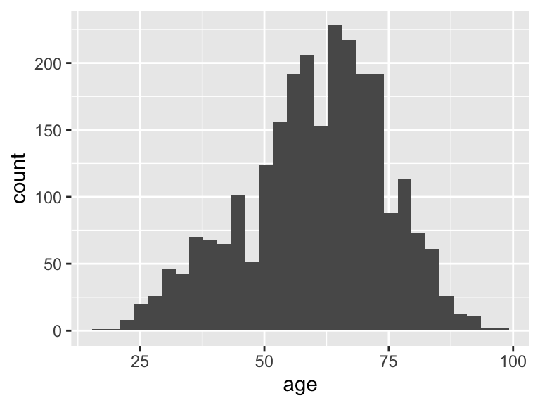A histogram is the appropriate visualization for interval data. Histograms returns values on a continuous scale as opposed to individual values. To make a histogram, follow the same basic steps as before, but this time use geom_histogram() instead.