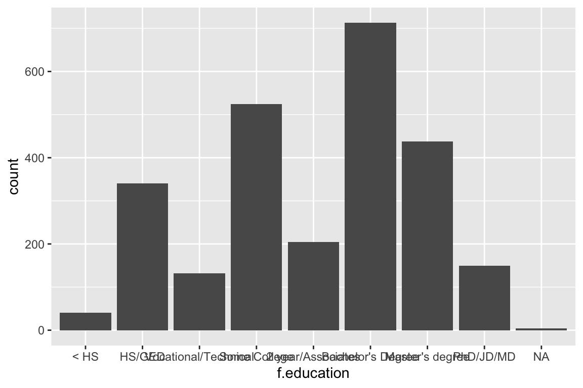 ds$f.education <- factor(ds$education, levels=c(1, 2, 3, 4, 5, 6, 7, 8),
