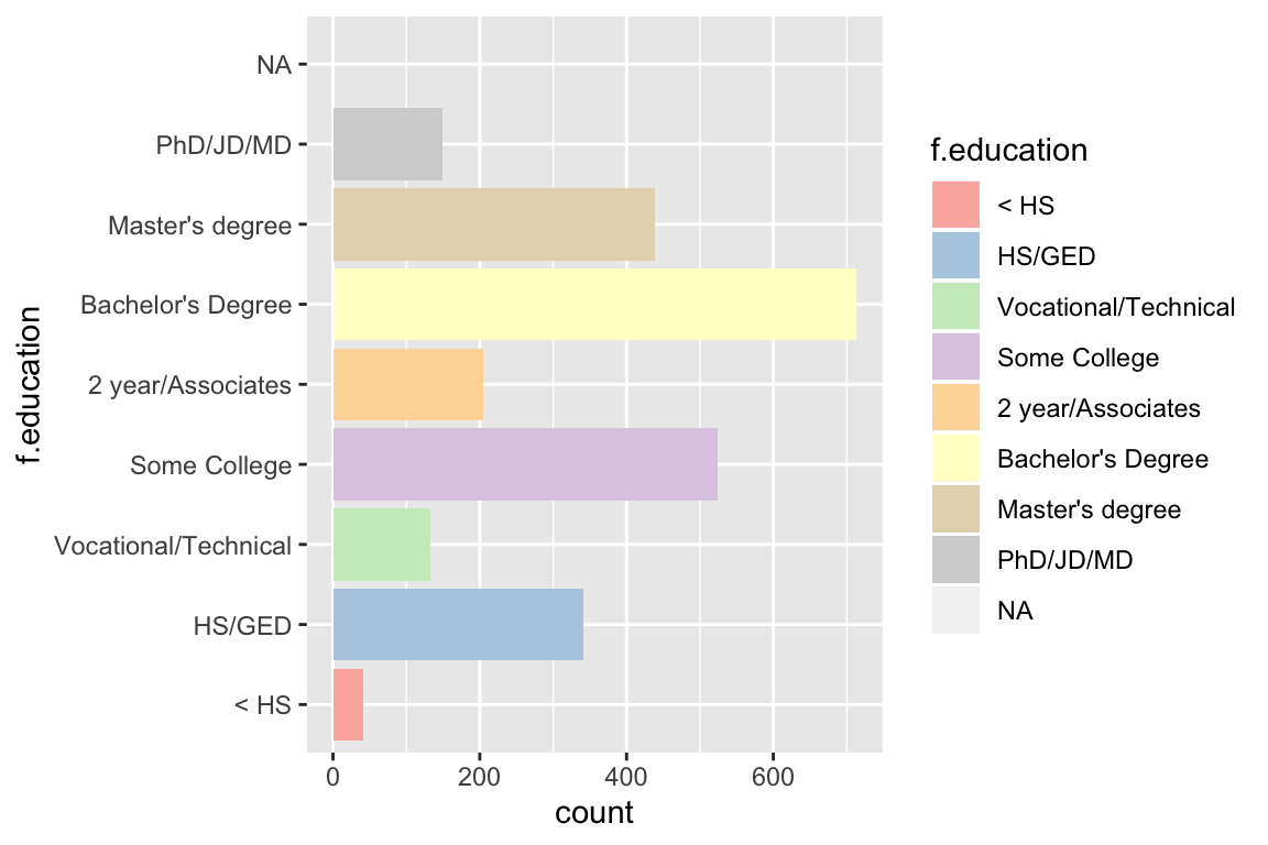 More detail is available by adding colors. There are a few different methods of adding colors using ggplot. Include fill = f.education to indicate that the bars will be filled with color, and scale_fill_manual() to indiciate the colors: