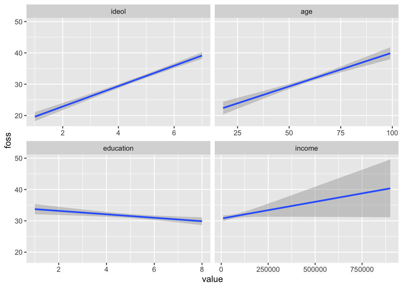 Now we can see the general relationship between each independent variable and the dependent variable. The geom_smooth() function defaults to showing 95% confidence intervals. You can disable the confidence intervals with the se=FALSE argument, but that is not recommended. Notice the very large confidence interval in the income visualization, especially at the higher income levels. This happens because there are fewer observations with very high incomes. A smaller sample size leads to a larger standard error, and in turn larger confidence intervals.