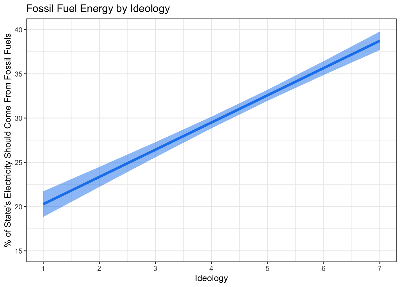 Recall that the earlier hypothesis stated that the more conservative a respondent, the more electricity they will prefer comes from fossil fuels. We can safely reject the null hypothesis, given the clear relationship and overall evidence that there is a positive relationship. To conlcude, let’s build a solid, paper-worthy visualization of the relationship between ideology and opinions on fossil fuels from our model.