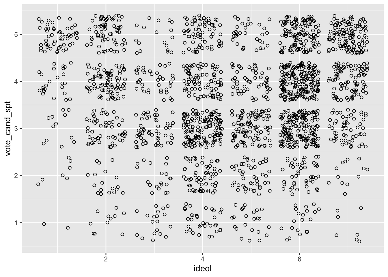 A critical assumption of OLS is that the relationship between variables is linear in their functional form, therefore it is imperative to inspect whether a model consist of non-linear relationships between variables of interest. As the book describes, regression diagnostics is largely an art. To demonstrate, suppose you want to examine the relationship between ideology and candidate support in the 2016 presidential election. The survey associated with the class data set asked respondents to indicate on a scale of 1 to 5 the level of support they have for the candidate they voted for in the 2016 presidential election. We will start by exploring data in preparation for a linear regression model:
