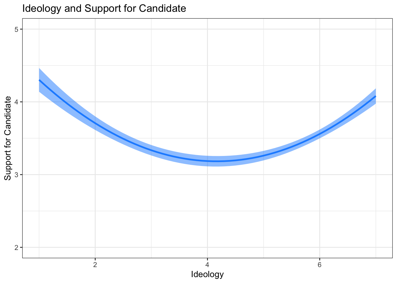 For example, when thinking about how ideology might influence candidate support, you could imagine this might be an instance when a quadratic model would be appropriate. Think about it: it wouldn’t make sense to theorize that the more conservative an individual, the more enthusiastic they were for the candidate they voted for (regardless of who the candidate was), but it does make sense to theorize that the more ideologically extreme an individual is (very liberal or very conservative) the more they supported the candidate they voted for. Perhaps the moderates voting in the 2016 election felt left our or alienated by the polarized political environment, and therefore might have had less support for the candidate they voted for.