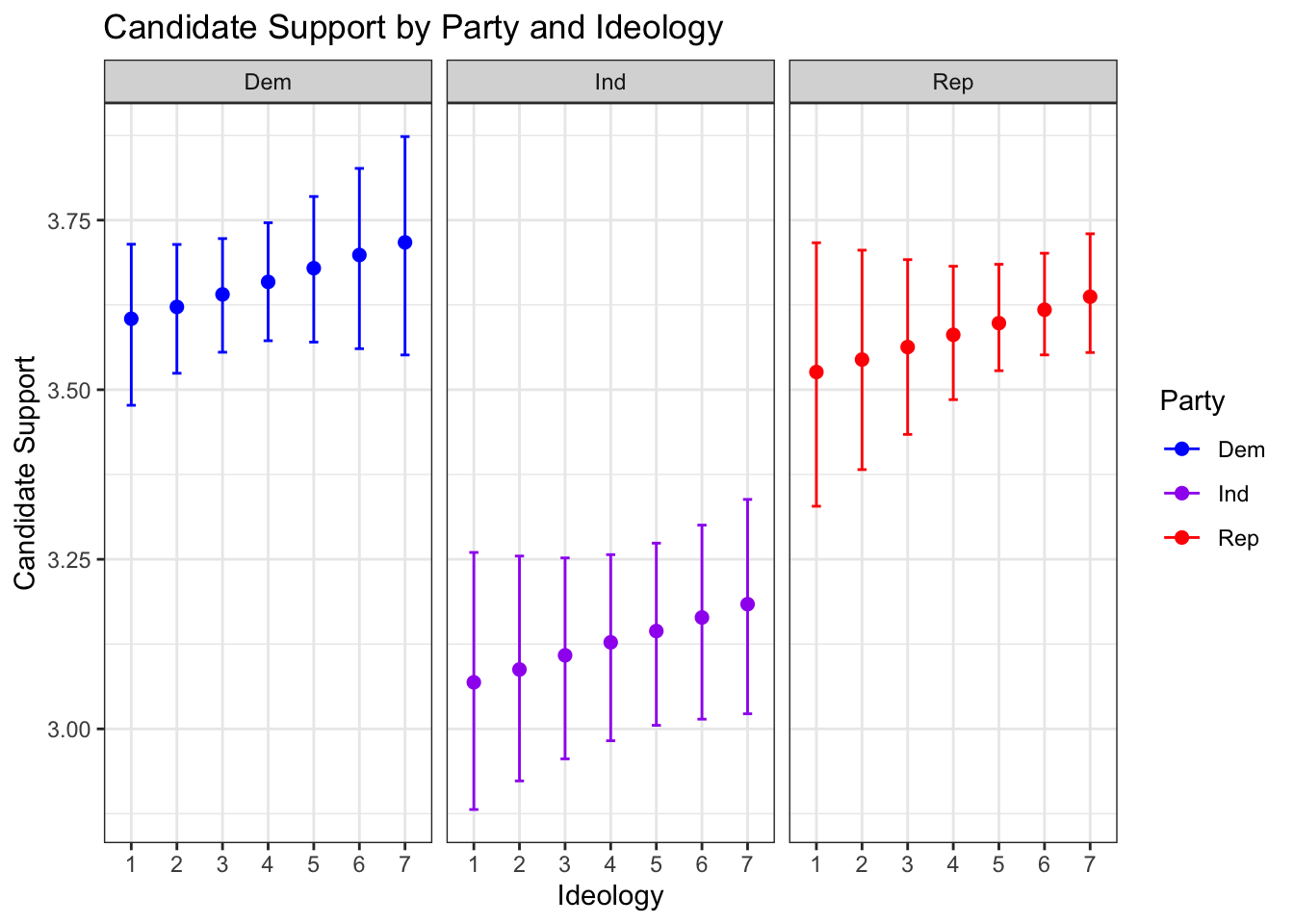 Let’s move onto a different model that might provide some interesting findings. In a previous lab we looked the relationship between ideology and support for the candidate an individual voted for. Recall that we used polynomial terms to find a better model fit and concluded that the relationship was not strictly linear. Let’s take that question one step further and break it down by political party. Perhaps there are linear relationships when we look at candidate support by ideology and party. We use Zelig to run simulations and predict values of candidate support for each of the ideology levels based on political party.