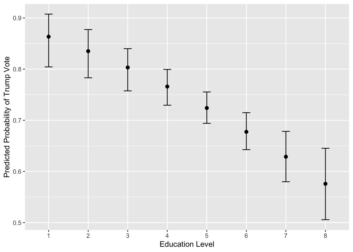 Logged income and age are held at their means, education is sequenced from 1 to 8, and there are three other groups of values. Qi_ci_min is the lower limit, qi_ci_median is the estimate, and qi_ci_max is the upper limit. Let’s plot them. Make sure to use factor(education) to treat each level separately.