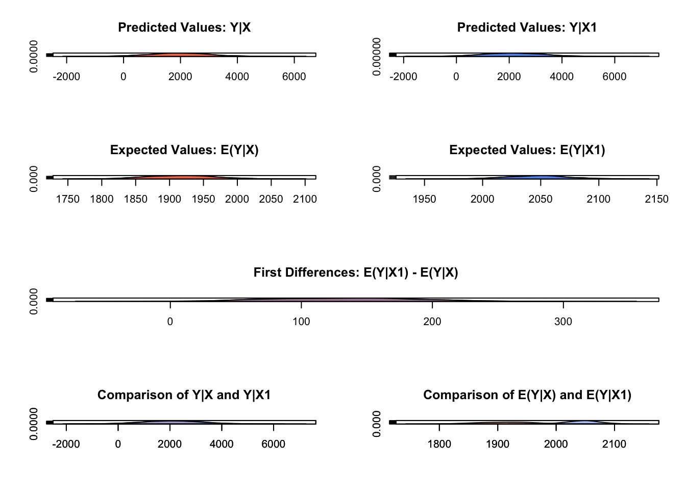 zelig()function to estimate parameters.setx()to set values.sim()to simulate the quantities of interest.plot()to visualize the simulation results.