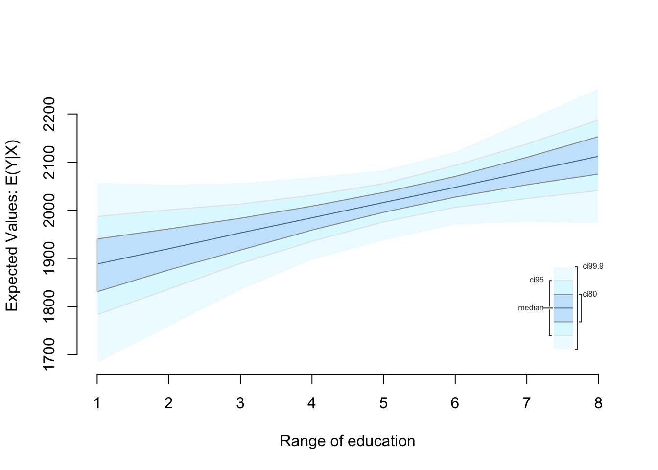 We can use Zelig to simulate based on a range of values, similar to how we would sequence one independent variable when we would predict values in past labs. Let’s simulate the data for the whole range of education values, from 1 to 8. We use the pipe operator, %>%, to simplify the syntax.
