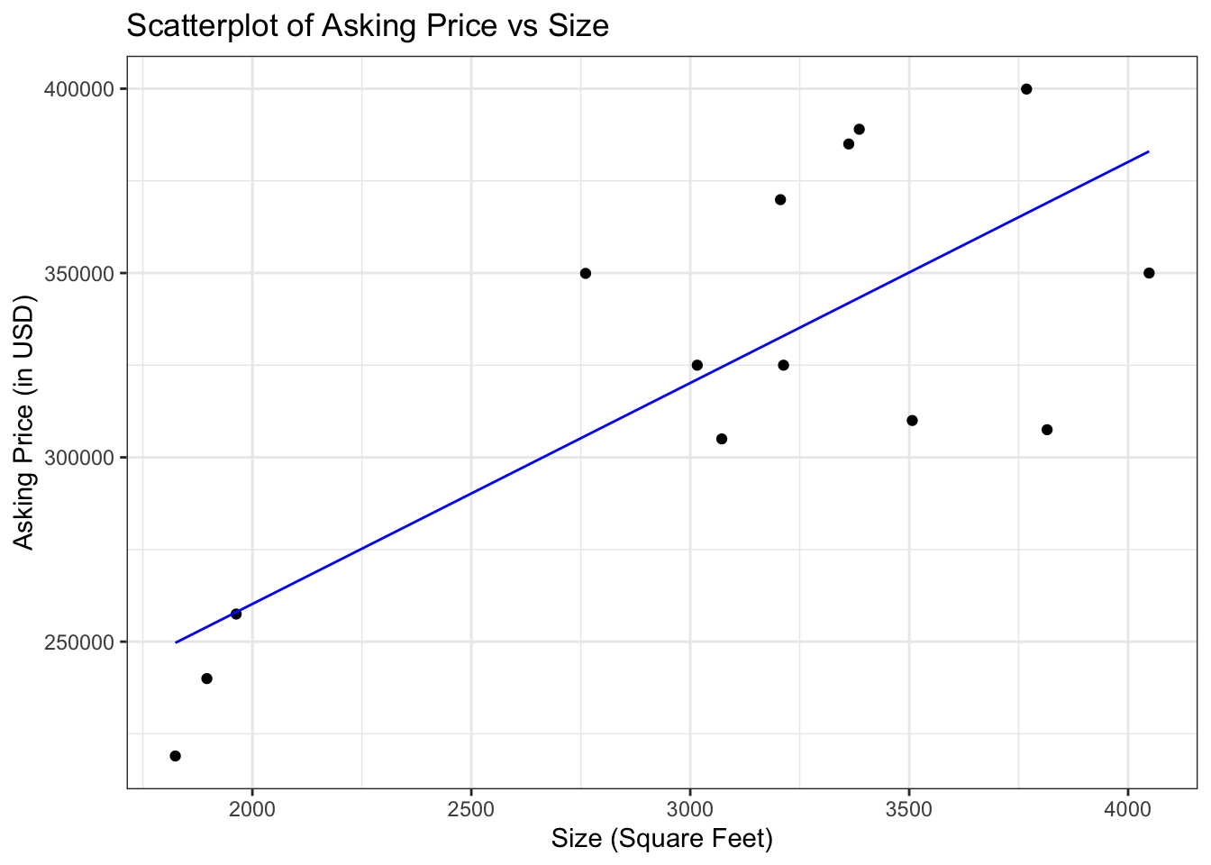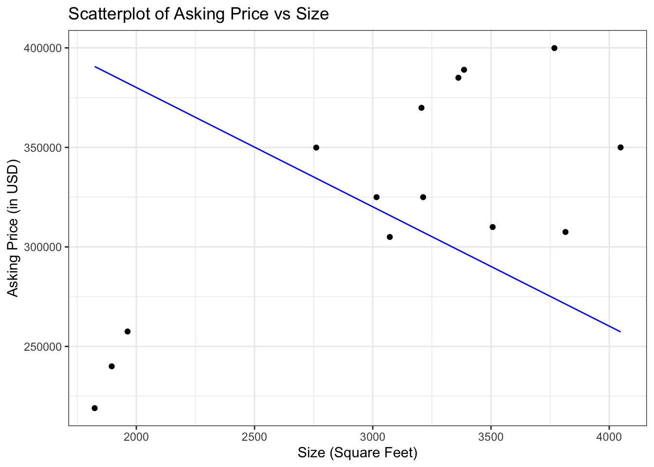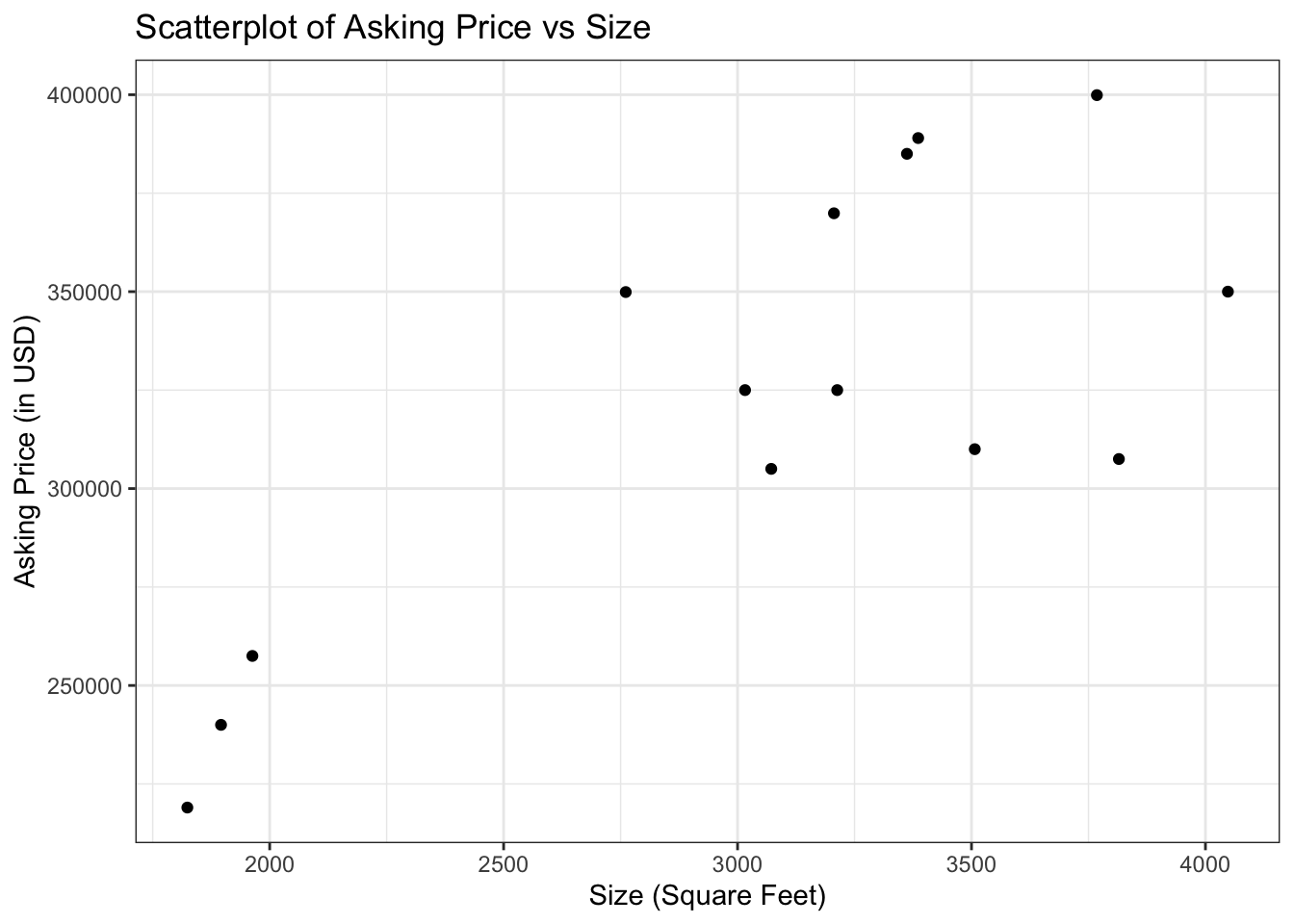 Each home has a value for its asking price (in dollars) and another for the size of its living space (in square feet)