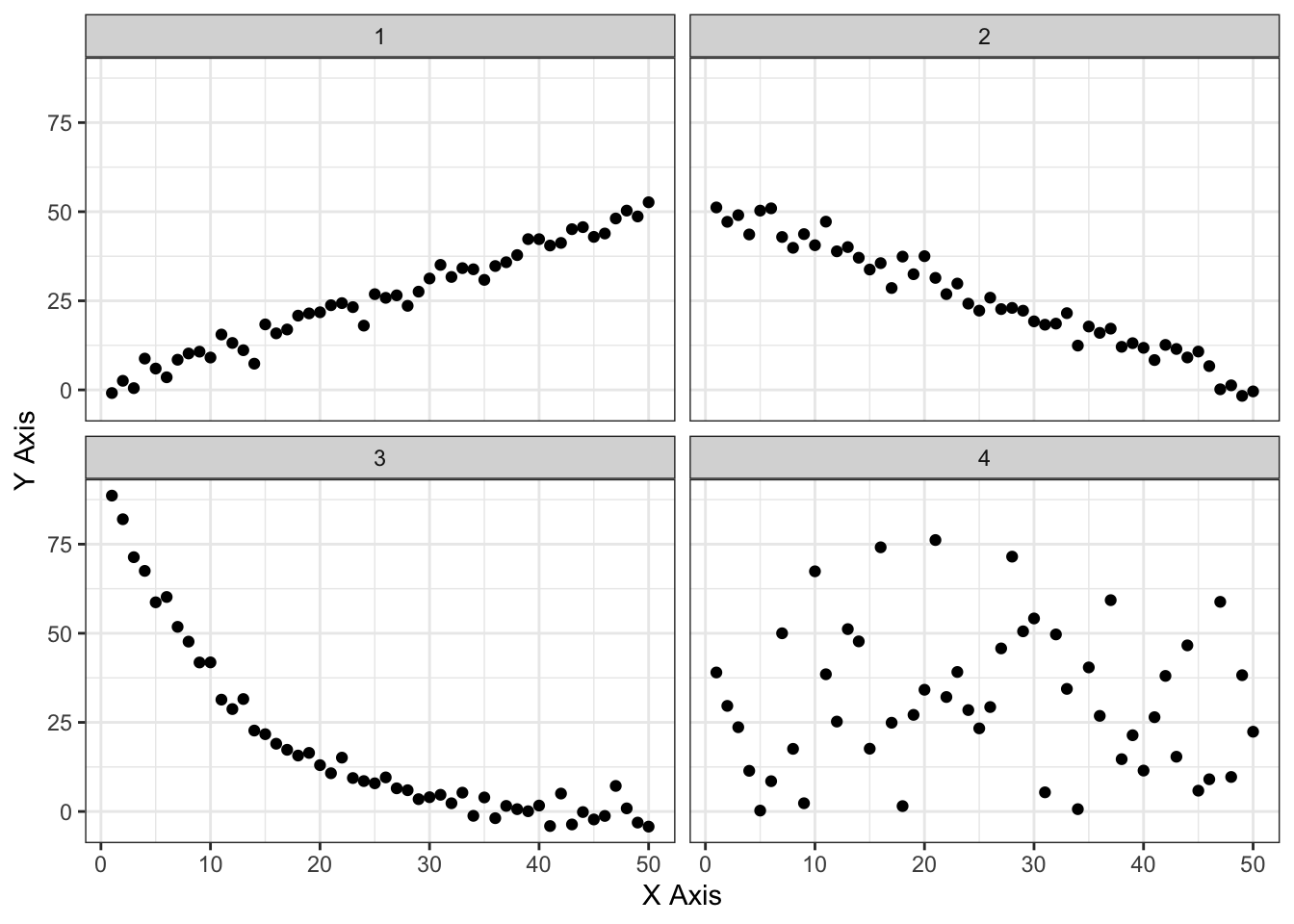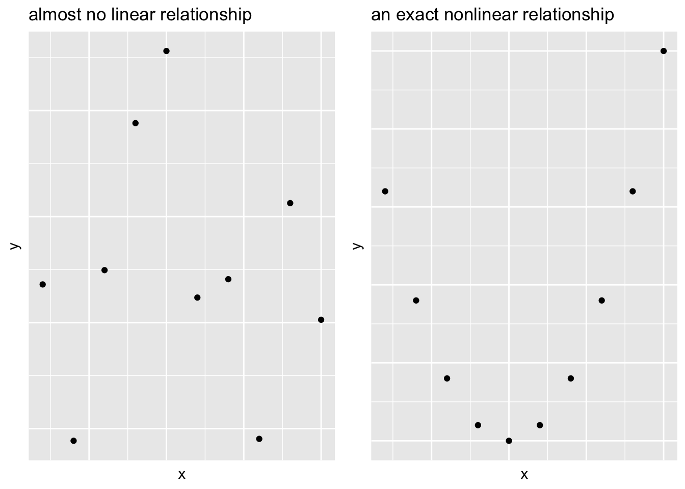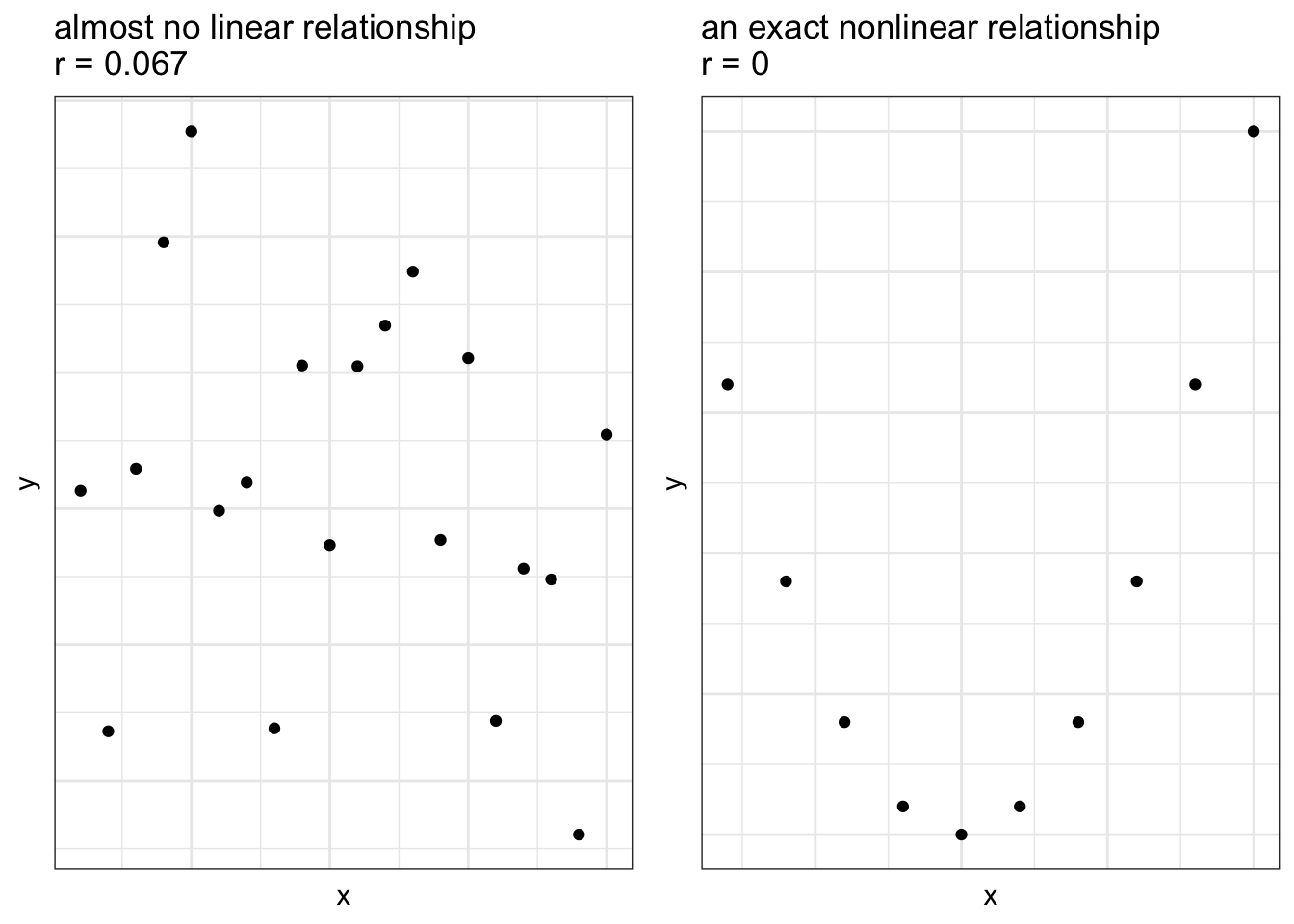 - Correlation measures only the linear relationship and may not (by itself) detect a nonlinear relationship