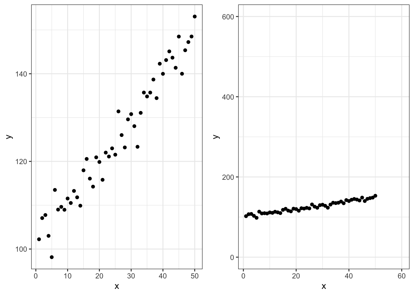 The y-intercept is \(b_0\) is the point where the line crosses \(y\)-axis. This has two meanings