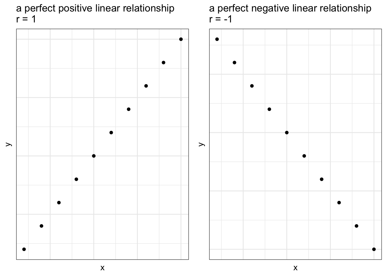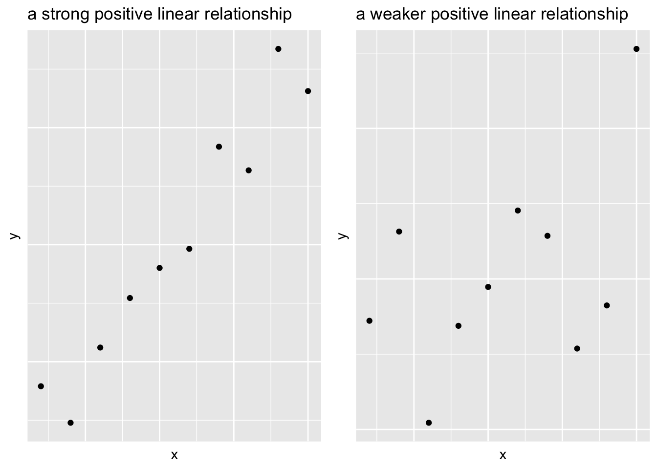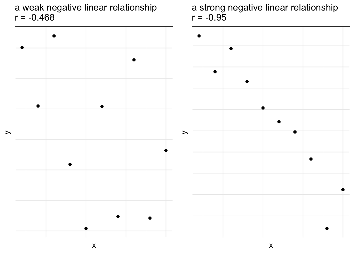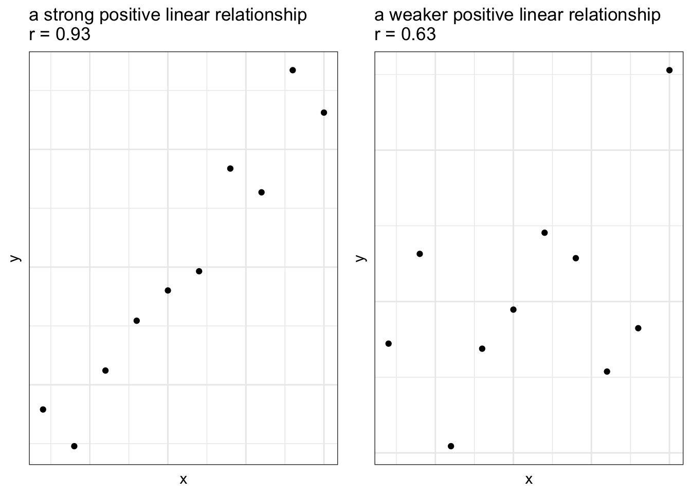 The closer \(r\) is to 0, the weaker the linear relationship between \(x\) and \(y\)