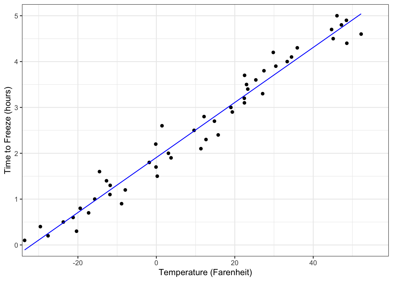 The least square regression line is \(\hat{y} = 1.908 + 0.06x\) where \(x\) is temperature in freezer in Fahrenheit and \(y\) is the time it takes to freeze.