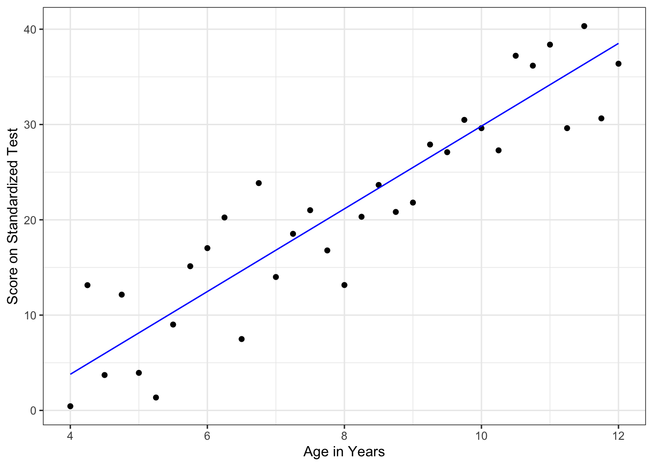 The least square regression line is \(\hat{y} = -13.568 + 4.340x\) where \(x\) is the age of an elementary school student and \(y\) is the score on the standard test.