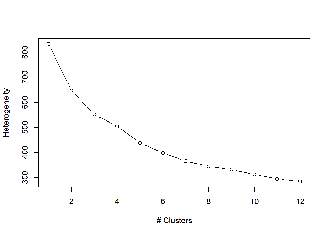 Often, we see a kink (the “elbow”) in the curve: the wss first drops quickly but then evens out. At the elbow, the optimal number of clusters has been reached. Adding more (and therefore smaller) clusters hardly leads to more homogeneous clusters, and often to the splitting off of small clusters that are hardly interesting.