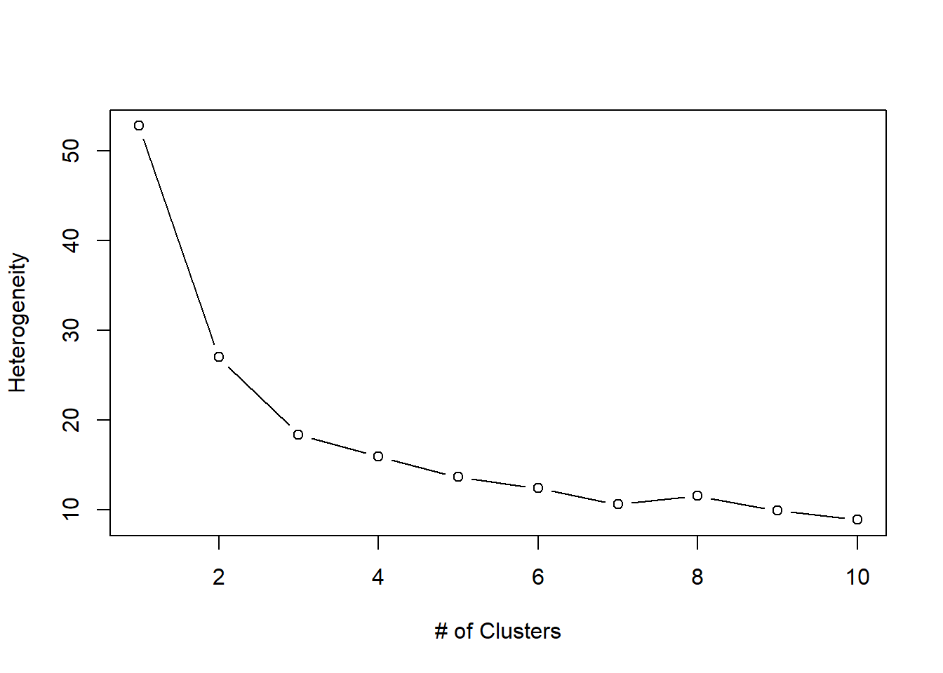 plot(1:c, wss, type="b", xlab="# of Clusters", ylab="Heterogeneity")
