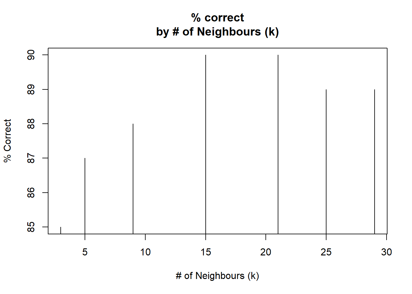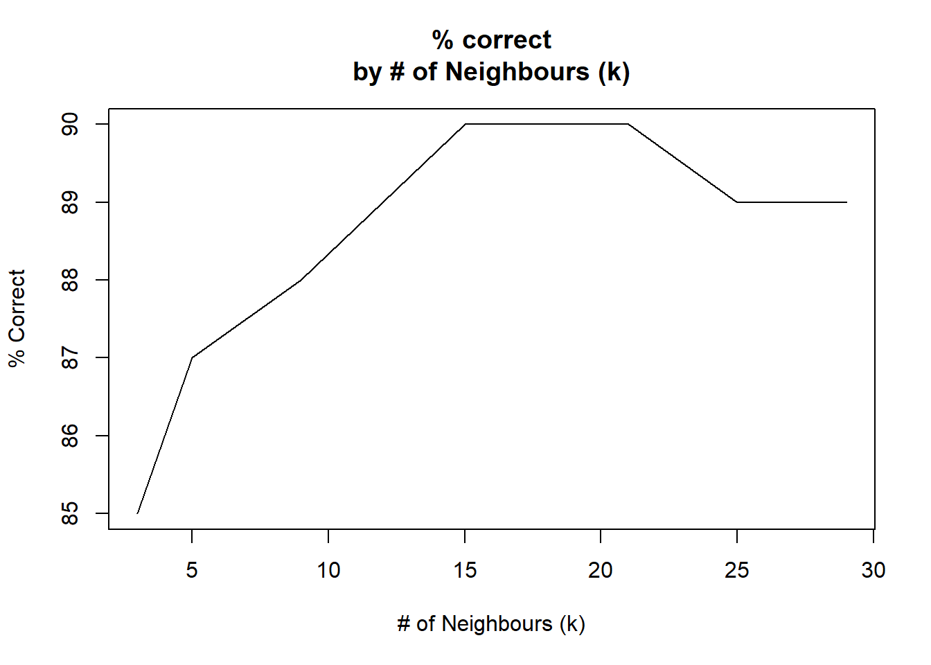 We have graphically displayed the results in a line chart, with the percentage of correct predictions on the vertical axis (y-axis), and the different values for the number of neighbors (k) on the horizontal axis (the x-axis).