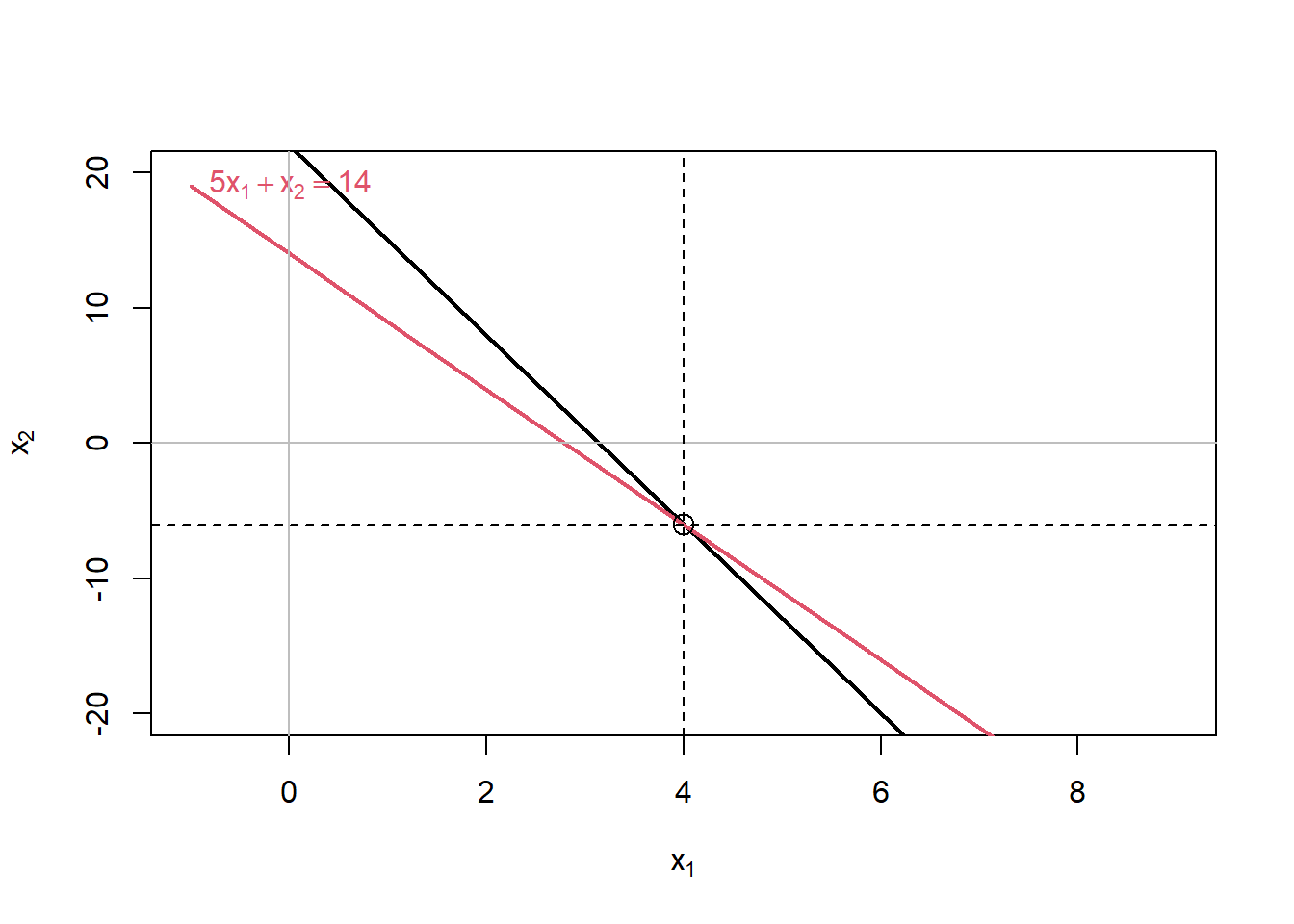 Rather than a line of numbers, we now have two dimensions. The relations represent lines in a two-dimensional space. As long as the lines do not run parallel to one another, there must be one single combination of values of \(x\) and \(y\) where the lines meet.