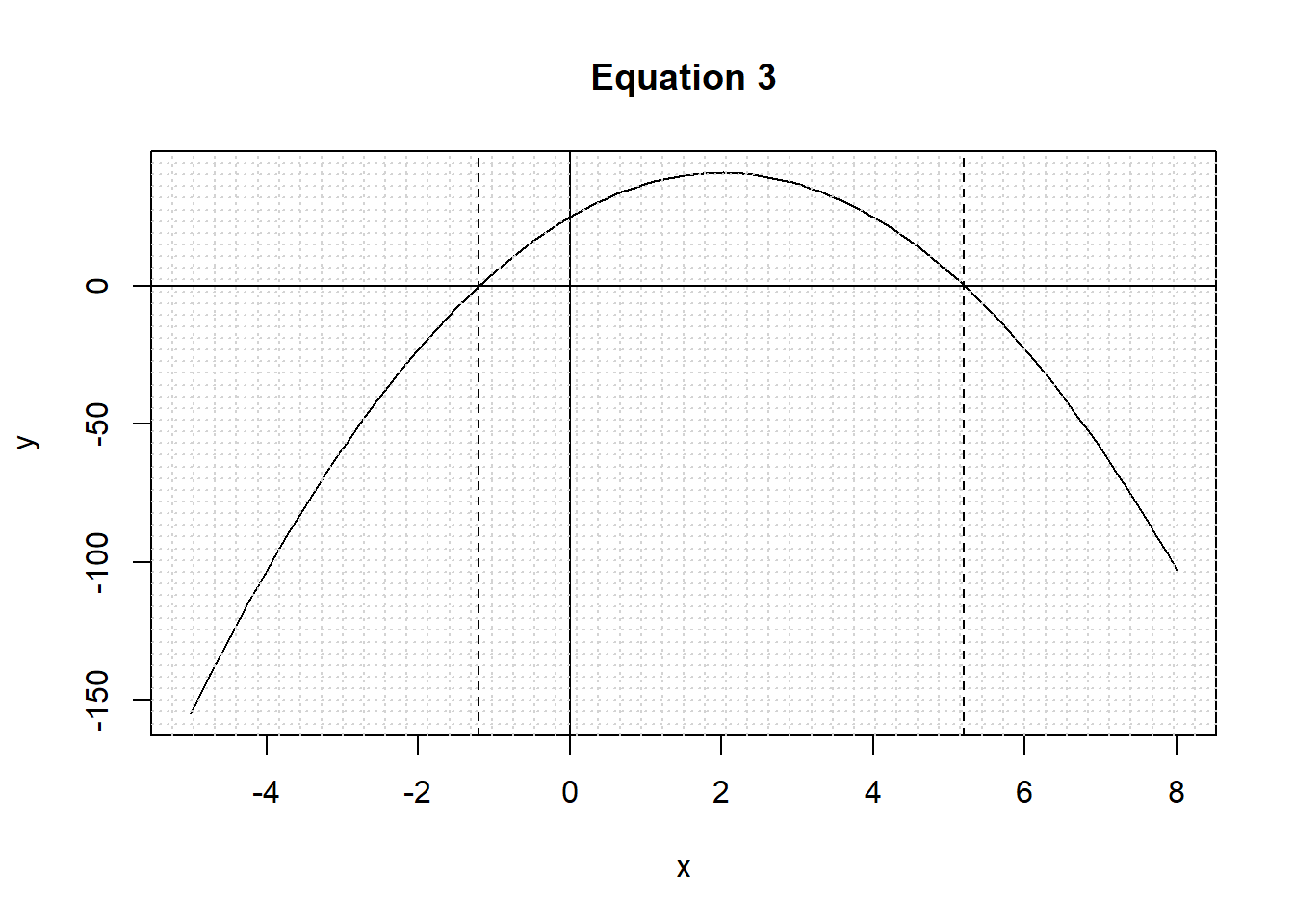 curve(-4*x^2+16*x+25, from=-5, to=+8,xlab="x", ylab="y", main="Equation 3")