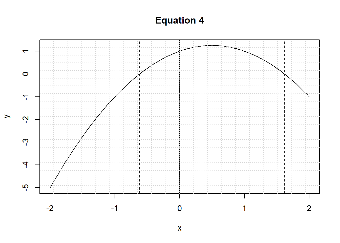 curve(-1*x^2+1*x+1, from=-2, to=+2,xlab="x", ylab="y", main="Equation 4")