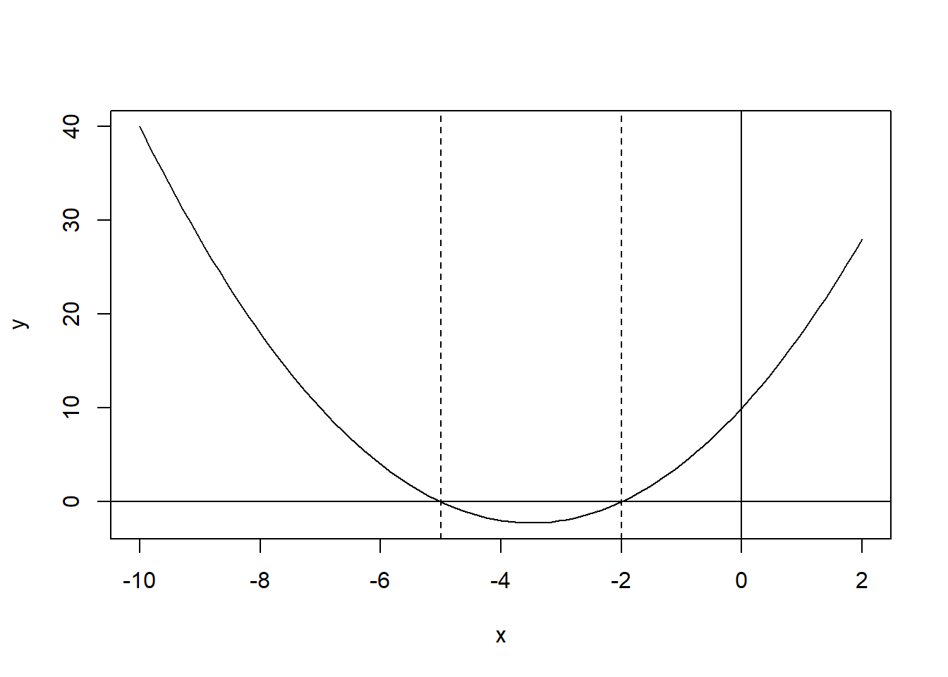 We can use R-commands to plot the function, and confirm that, indeed, at \(x=-2\) and \(x=-5\), y takes on a value of zero.