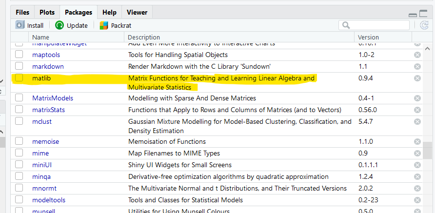 - We first invoke the functions in the matlib package, using the library() function. Before doing so, see to it that you have installed the package. In RStudio, check the Packages installed in the user library.