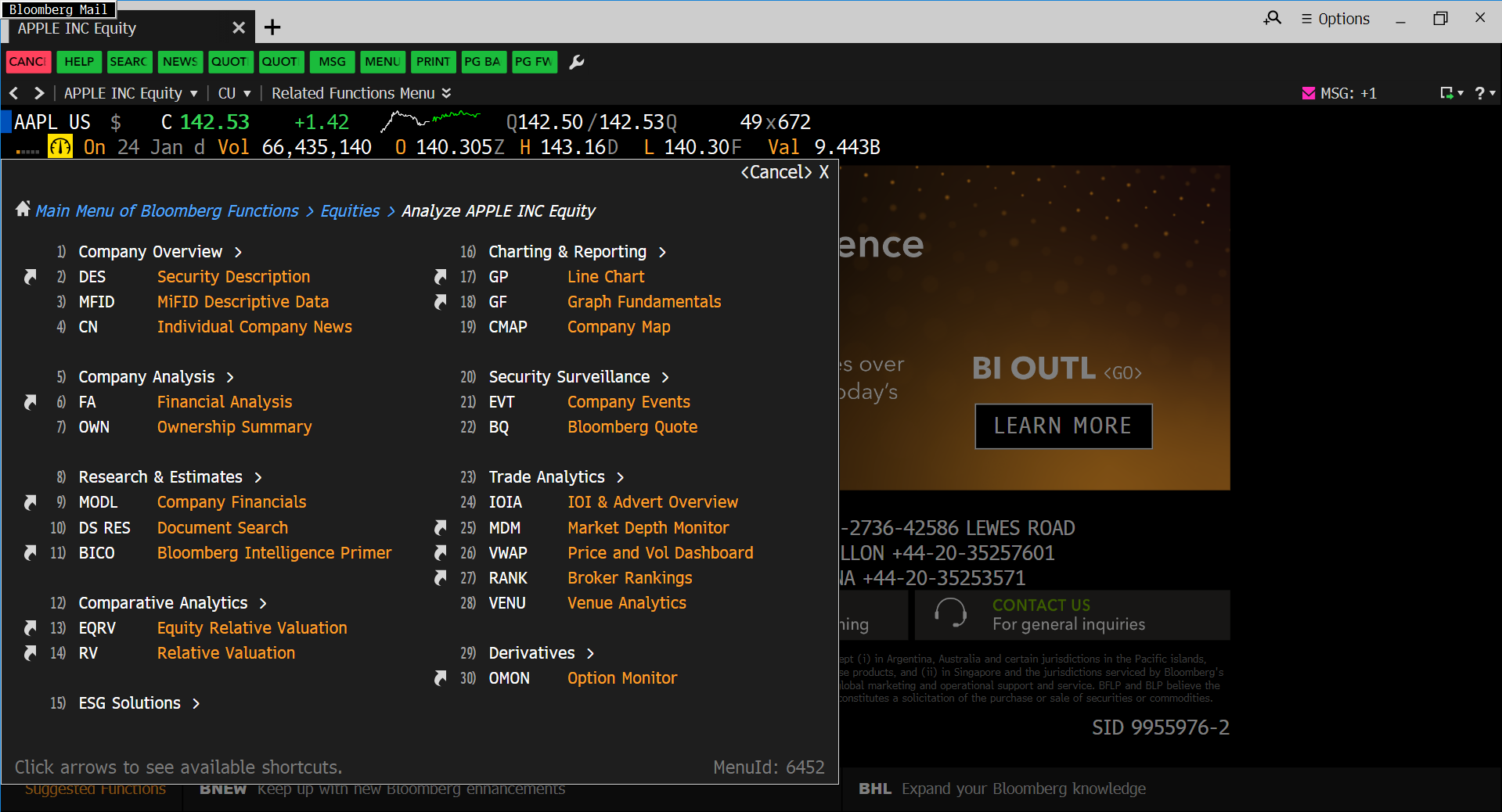 If you click on any of these offerings, you will be able to access detailed inforation about the security. For example, if you 2) DES you will get a detailed description of Apple and its operations. It is also possible to type AAPL US Equity DES directly into the command line to access the same information (see below for more details about using function-security pairs.