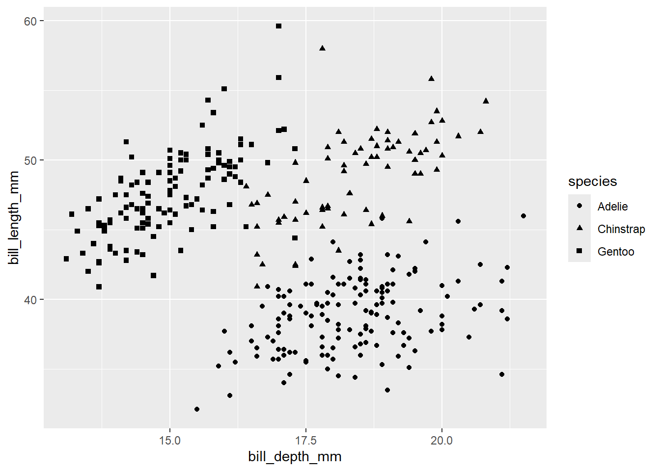 ggplot(aes(x = bill_depth_mm, y = bill_length_mm, shape = species)) +
