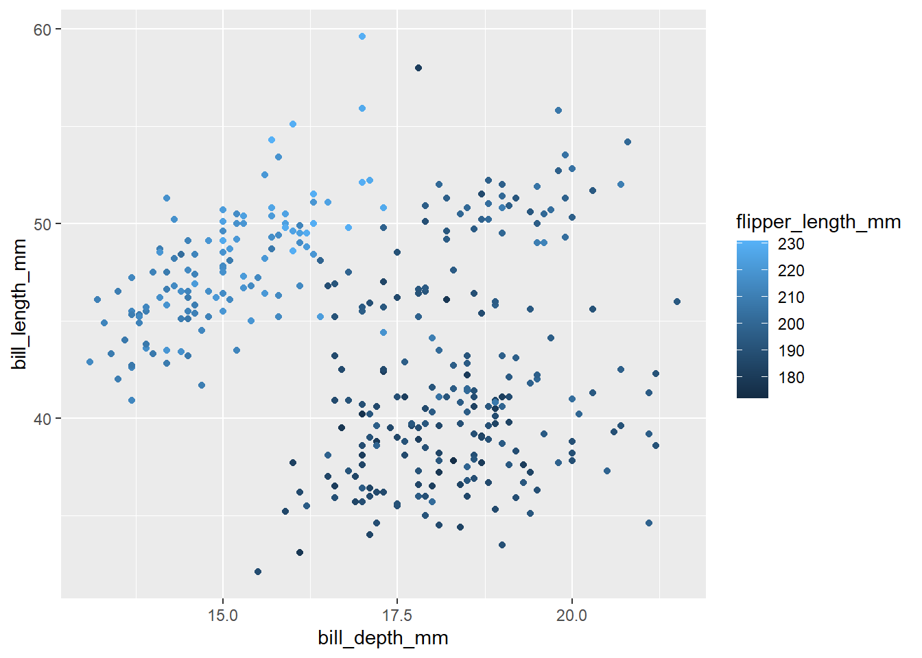 ggplot(aes(x = bill_depth_mm, y = bill_length_mm, color = flipper_length_mm)) +