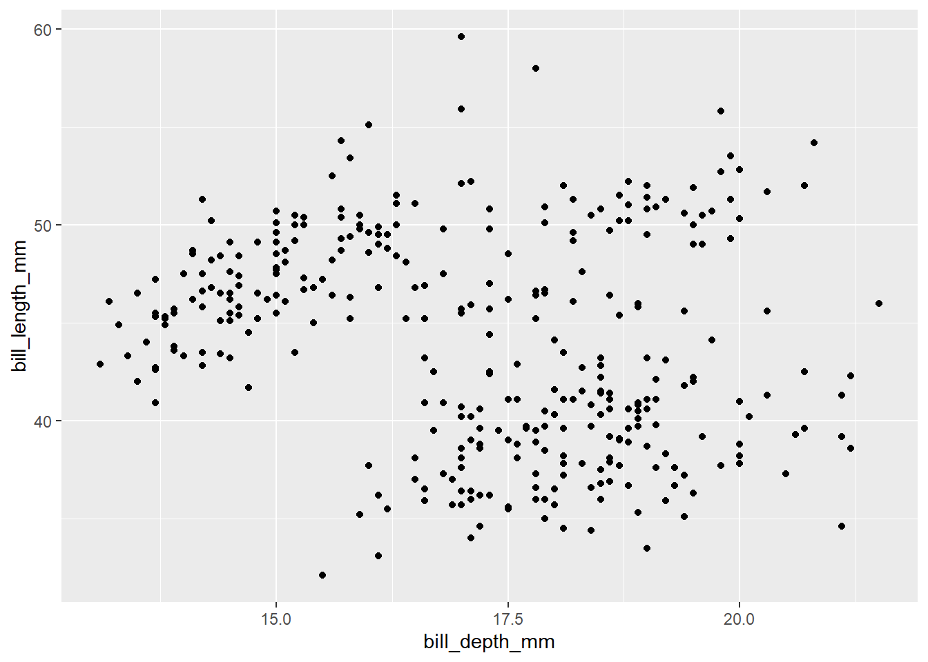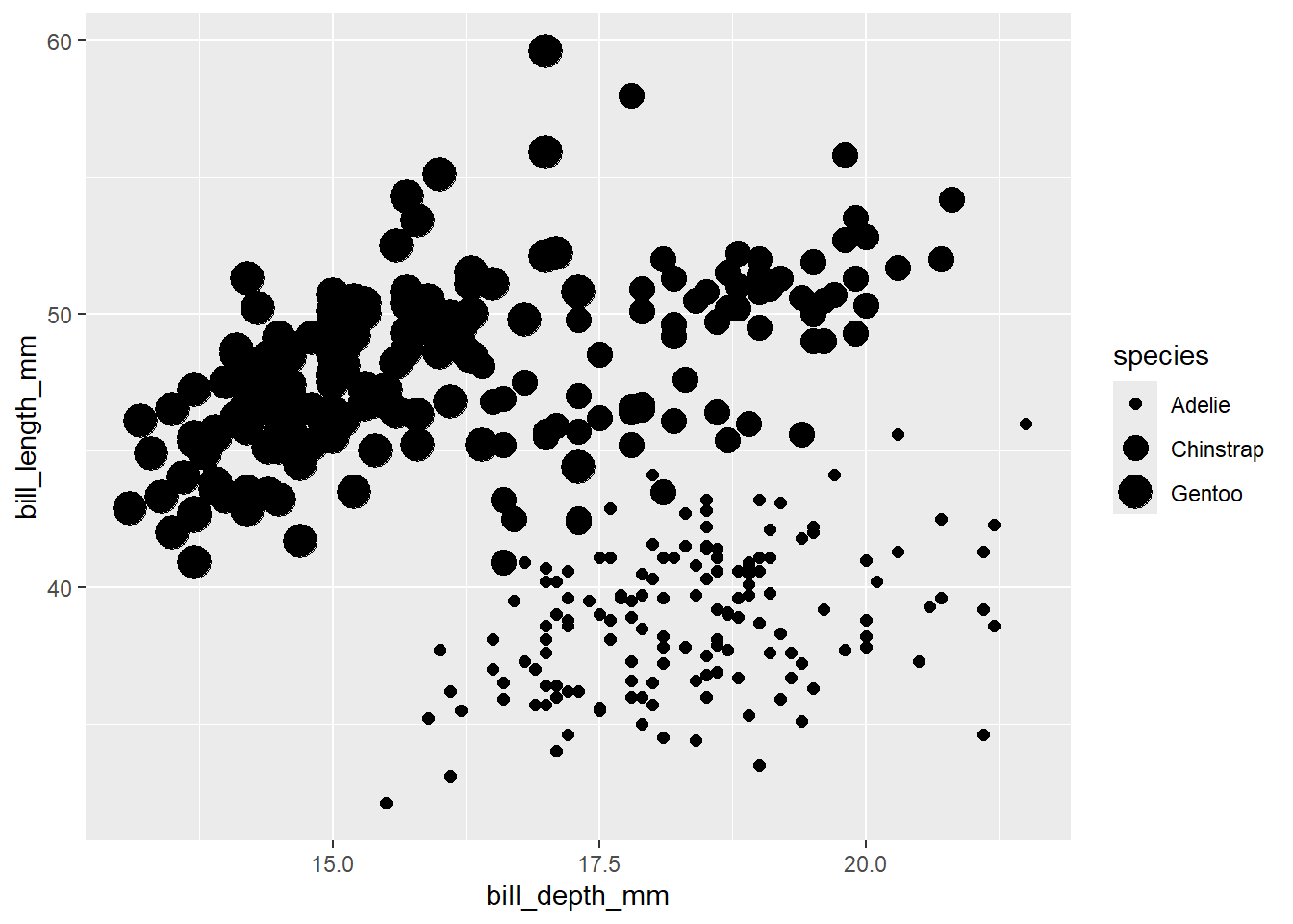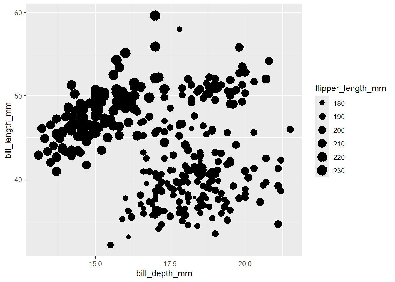 ggplot(aes(x = bill_depth_mm, y = bill_length_mm, size = flipper_length_mm)) +