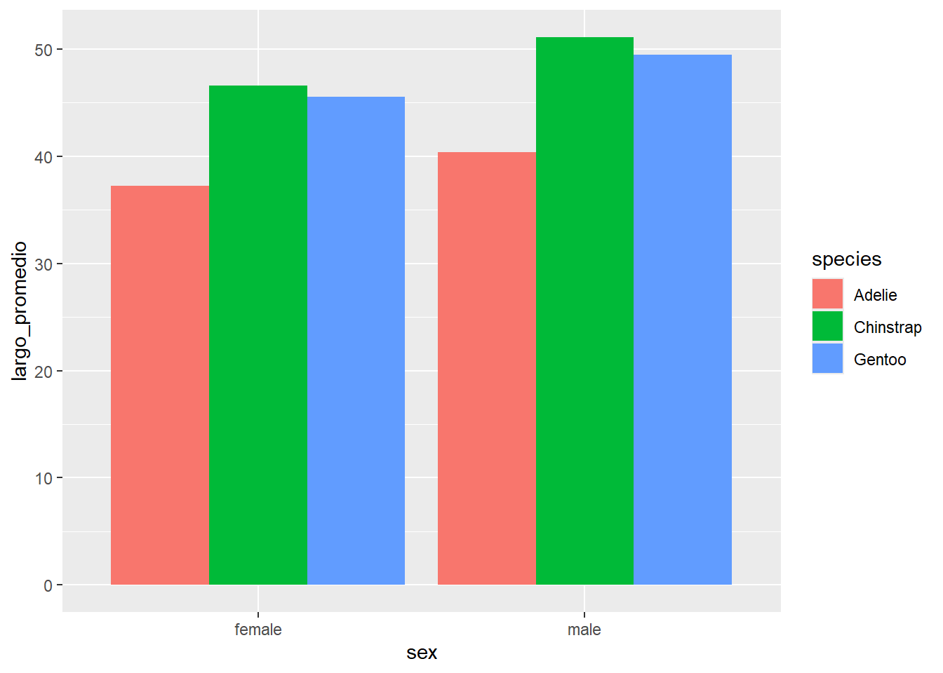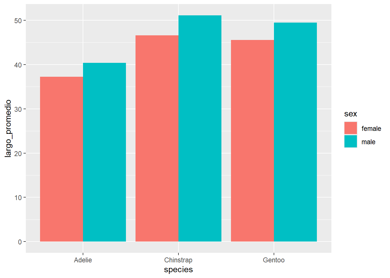 Por ejemplo, retomemos el ejemplo en la sección “Gráficos de barras”, en el cual graficamos el largo de pico promedio por especie de pinguino en la isla Palmer. Un análisis interesante podría consistir en visualizar el largo promedio de pico para cada cambinación de las variables sex y species. Agregar la variable sex al análisis no es problema, pues sex es una variable discreta (solo toma los valores male y female). Generar la tabla de entrada tampoco es problema, pues podemos usar group_by y summarise para calcular el largo promedio de pico para cada par de valores que pueden tomar las variables explicativas. El posicionamiento de las barras que más tiene sentido para este gráfico es dodge: