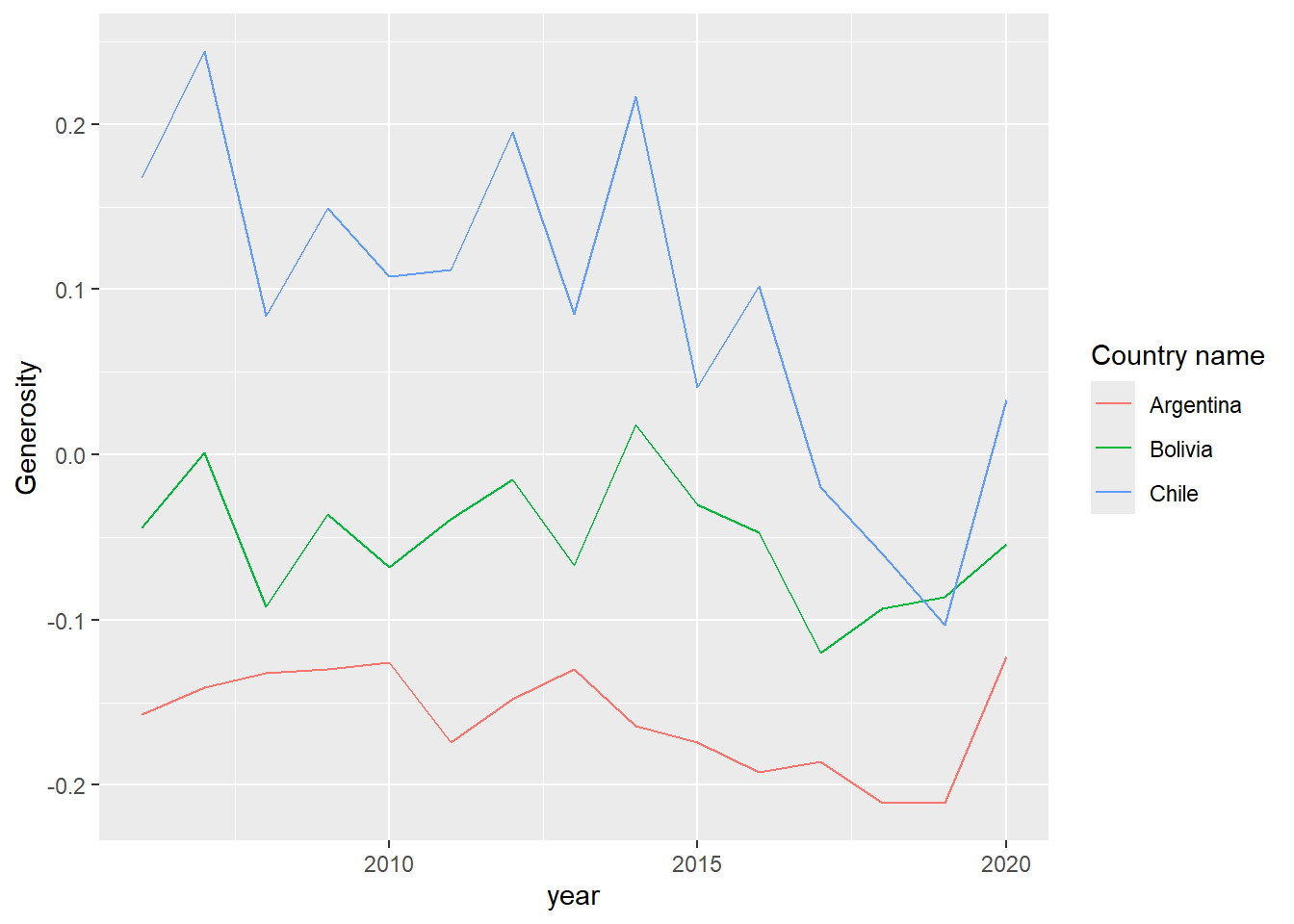 Retomemos el ejemplo en la sección “Gráficos de línea”, en el cual graficamos la evolución de la percepción de generosidad en Chile a lo largo de los años. Qué pasa si queremos comparar la generosidad ente Chile, Argentina y Bolivia. Filtremos dichos países en la base de datos y mapeemos la variable Country name a la estética de color.
