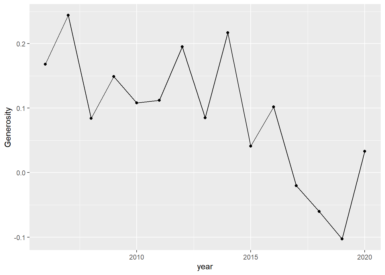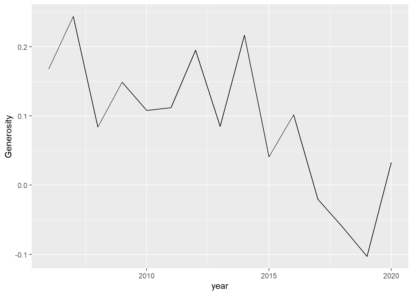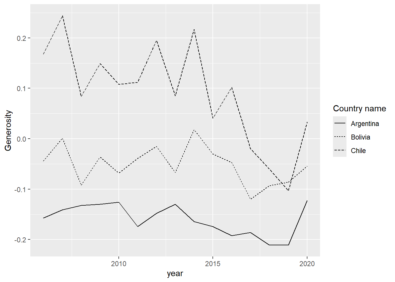 ggplot(aes(x = year, y = Generosity, linetype = `Country name`)) +