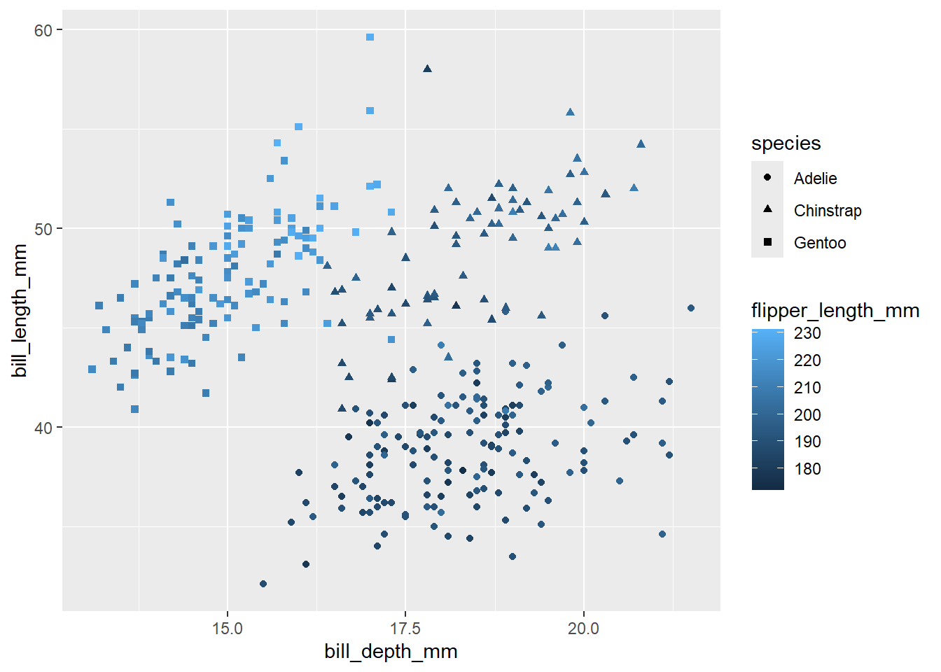 ggplot(aes(x = bill_depth_mm, y = bill_length_mm, shape = species, color = flipper_length_mm)) +