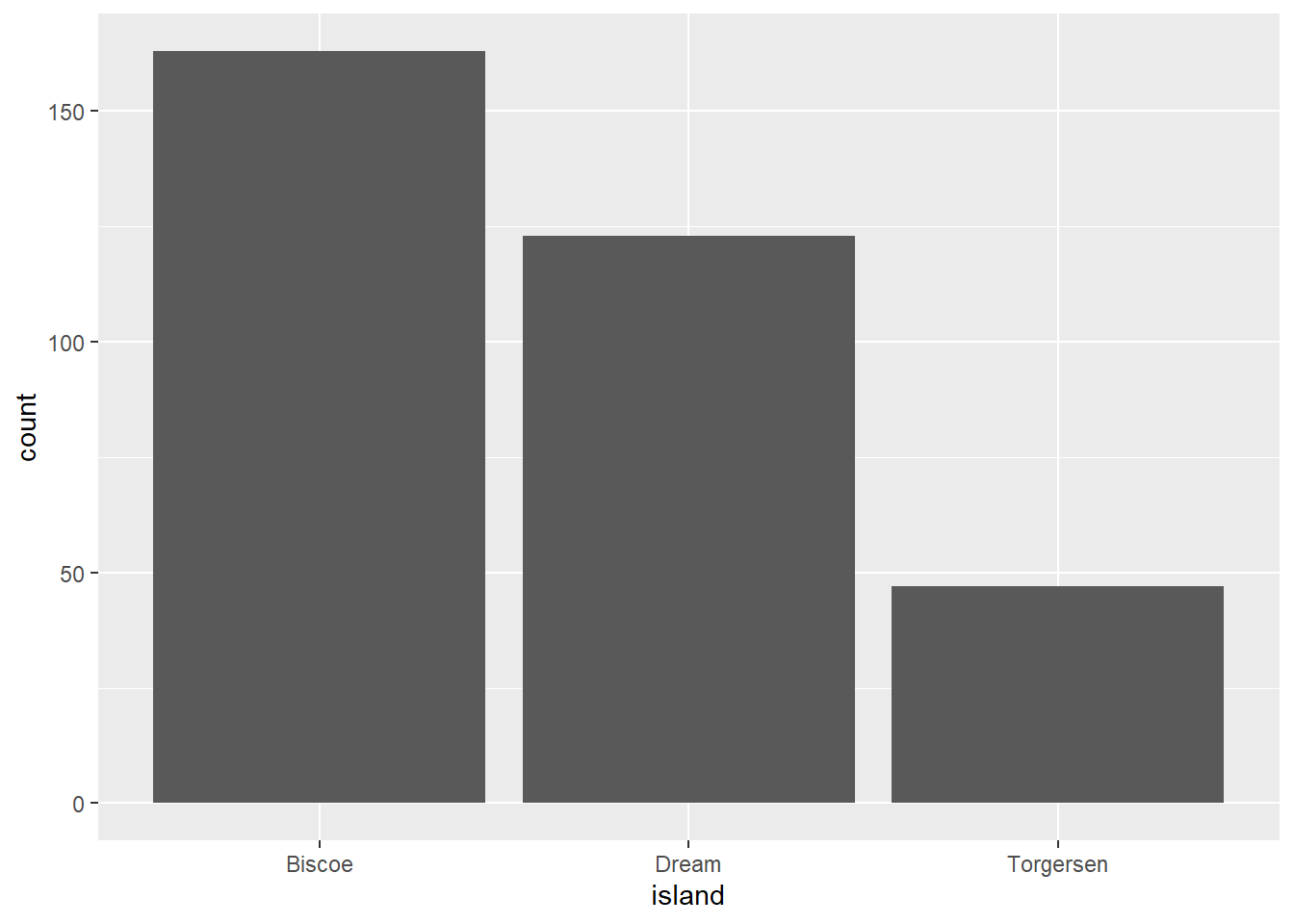 penguins %>% group_by(island) %>% summarise(count = n()) %>% ggplot(aes(x = species, y = count)) + geom_col()es equivalente a