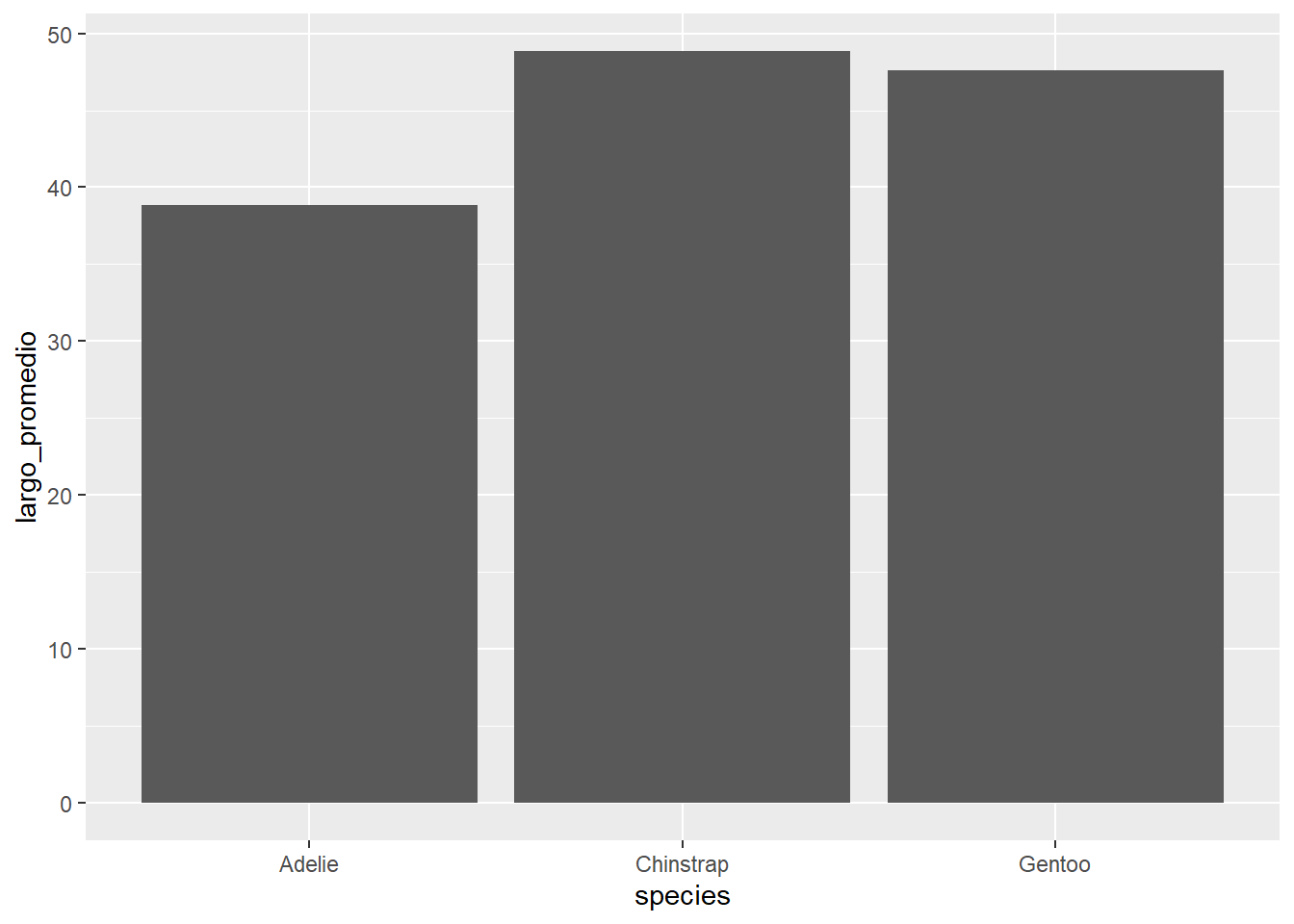 Tomando como ejemplo la base de datos de los pinguinos de Palmer, no podríamos hacer un gráfico de columnas que ilustre la relación entre la especie de los pinguinos y el largo de sus picos. Esto debido a que en cada especie, hay muchos pinguinos que tienen picos de largo distinto entre si. Lo que sí podríamos hacer es un gráfico de columnas para ilustrar la relación entre la especie los pinguinos, y el largo promedio de sus picos Esto requiere, eso sí, crear un nuevo tibble. Este gráfico lo podemos construir usando la geometría geom_col():
