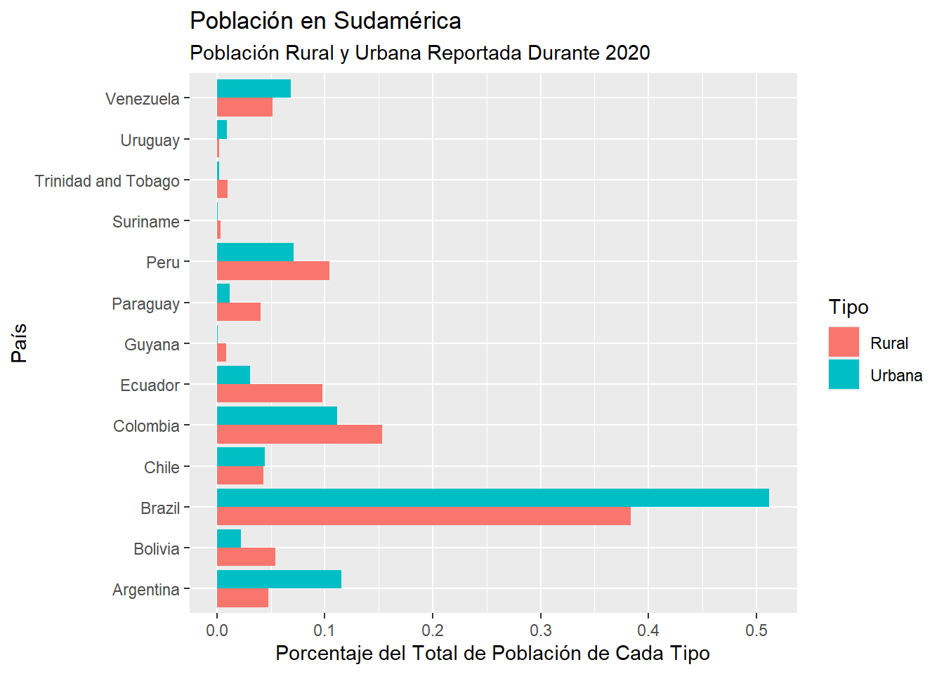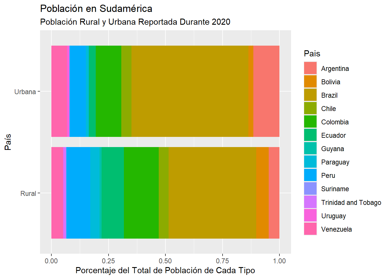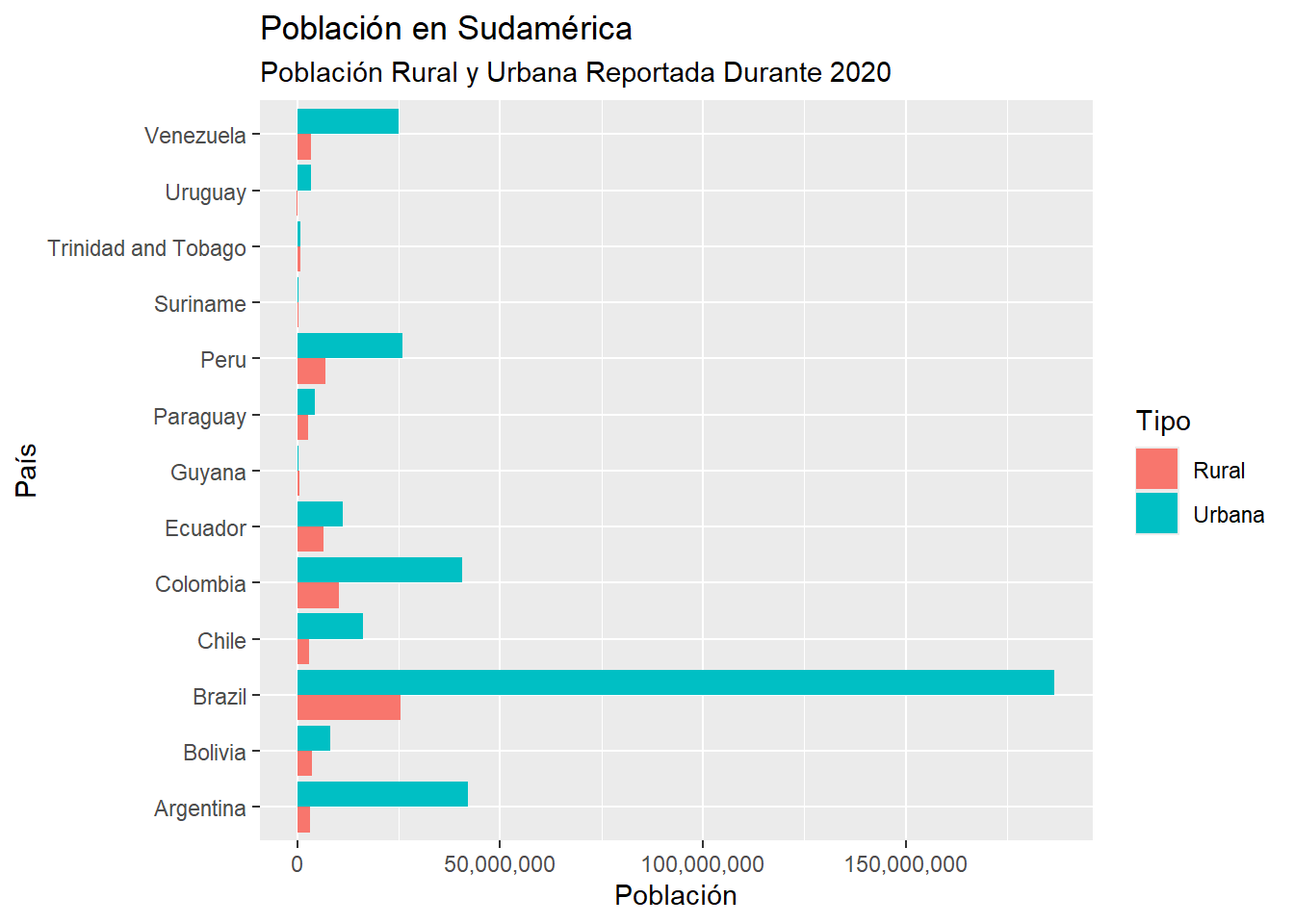 Este gráfico no es muy efectivo para comparar, por ejemplo, la población rural y urbana de Brasil con la de Guyana. Esto es debido a que las escalas de la población en ambos países es muy distinta.