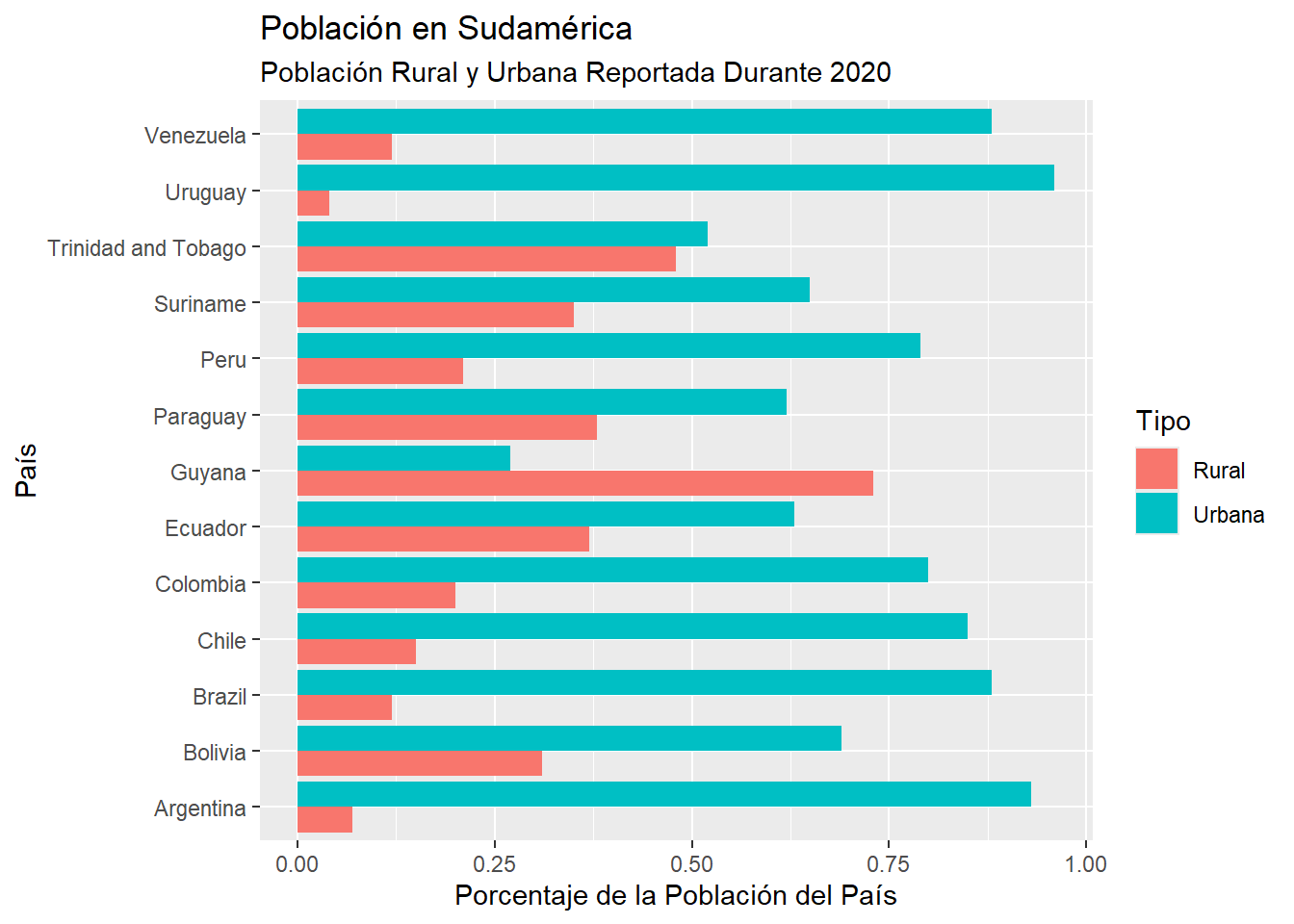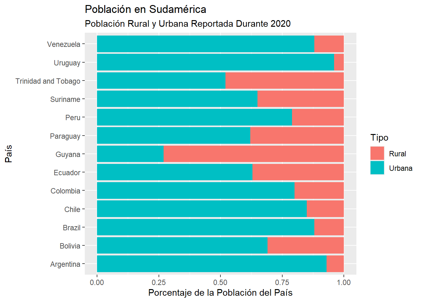 En particular podemos observar que, a diferencia del resto de países, Guyana tiene una mayoría de población rural. Además, Uruguay y Argentina son los países con una mayor proporción de población urbana en Sudamérica.