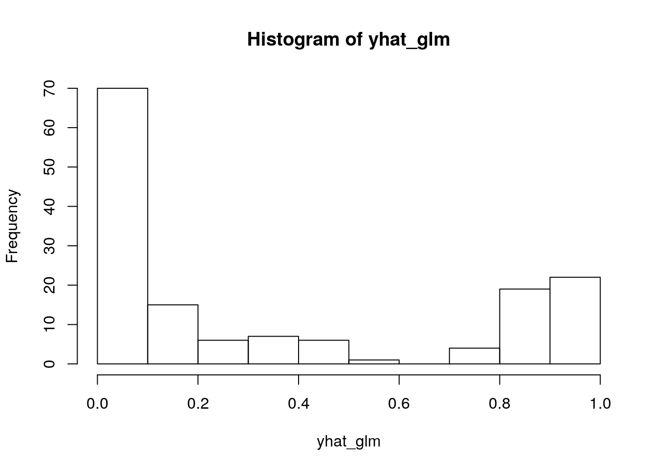 beta<- c(-1,2), and generate the response with:rbinom(n=100,size=1,prob=exp(x %*% beta)/(1+exp(x %*% beta))). Think: why is this the model implied by the logistic regression? - Fit a Logistic regression to your synthetic data using