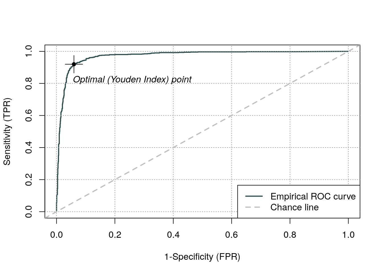 And see here fancier ROC libraries, e.g., with the ROCit package: