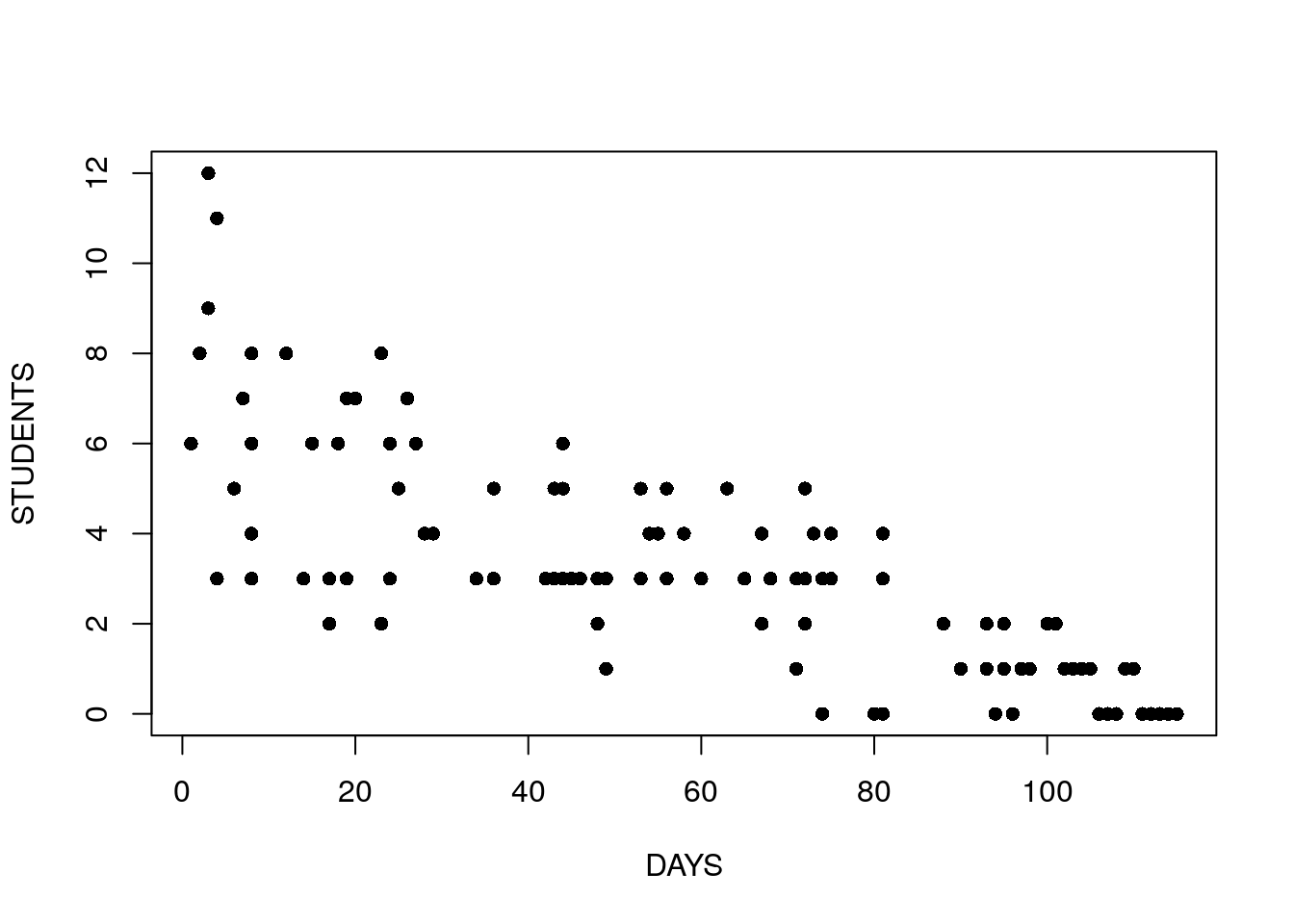 0L, 1L, 1L, 0L, 0L, 0L, 0L, 0L)), .Names = c("Days", "Students"