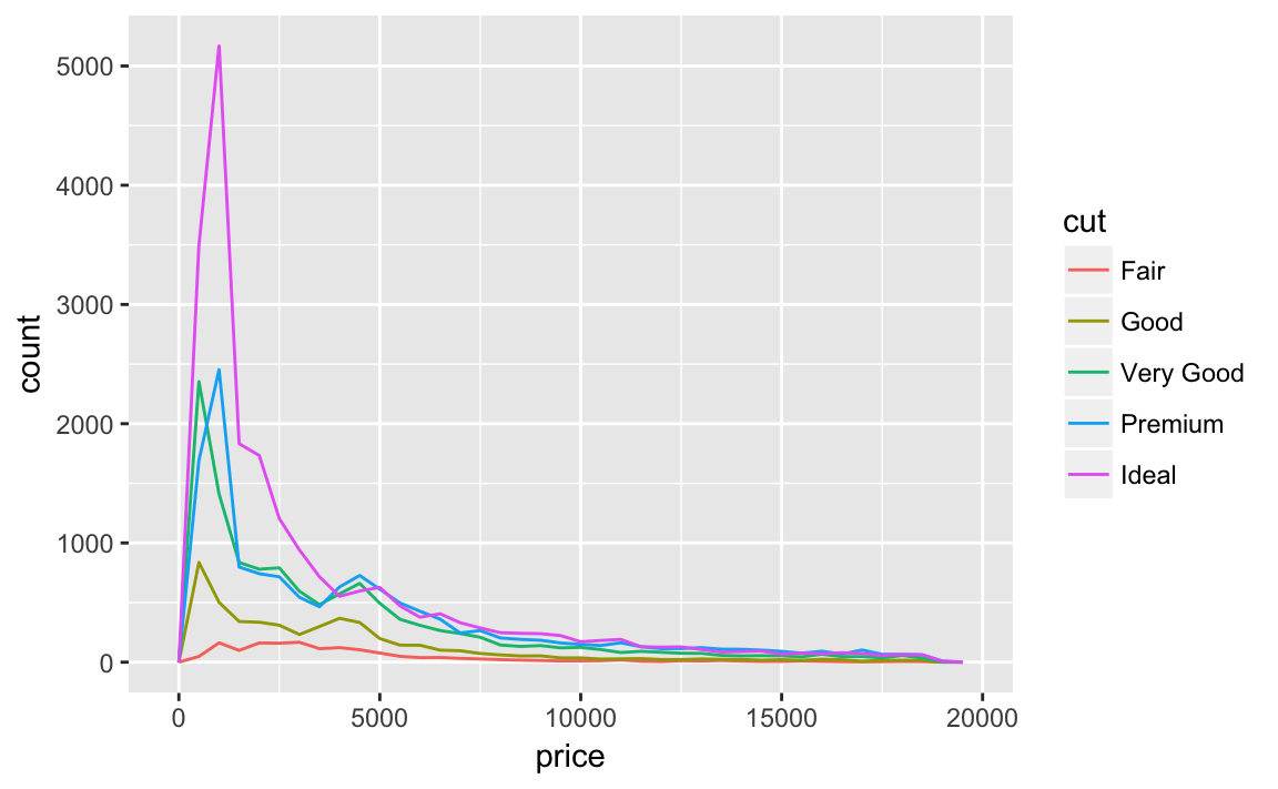 If you wish to overlay multiple histograms in the same plot, I recommend using geom_freqpoly() instead of geom_histogram(). geom_freqpoly() performs the same calculation as geom_histogram(), but instead of displaying the counts with bars, uses lines instead. It’s much easier to understand overlapping lines than bars.