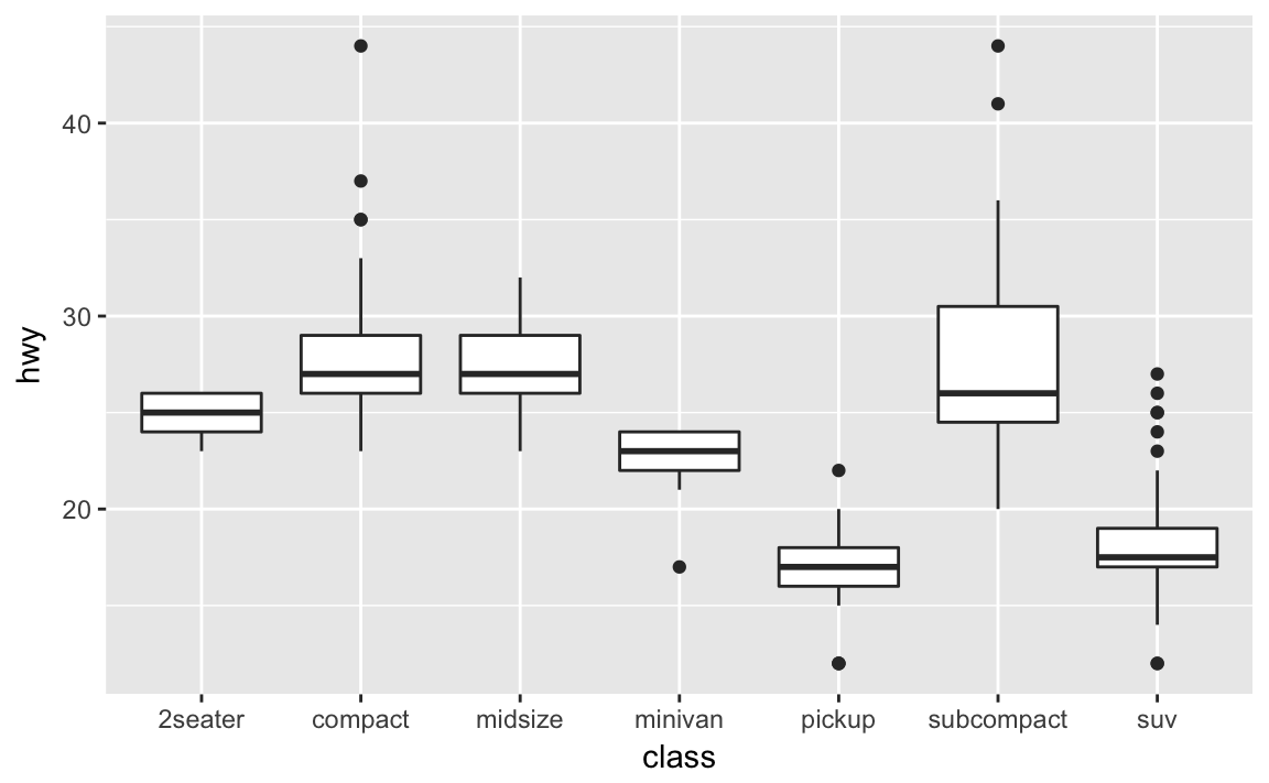 geom_boxplot(mapping = aes(x = reorder(class, hwy, FUN = median), y = hwy)) +