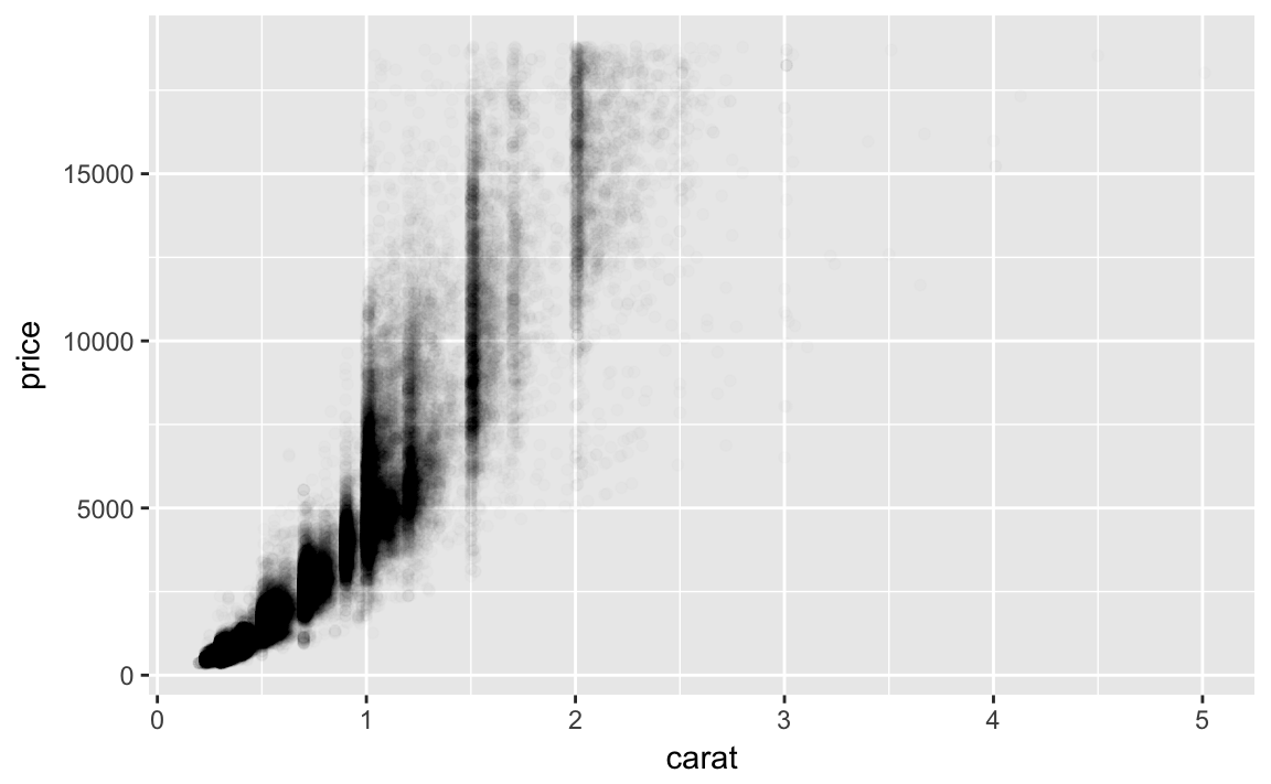 geom_point(mapping = aes(x = carat, y = price), alpha = 1 / 100)