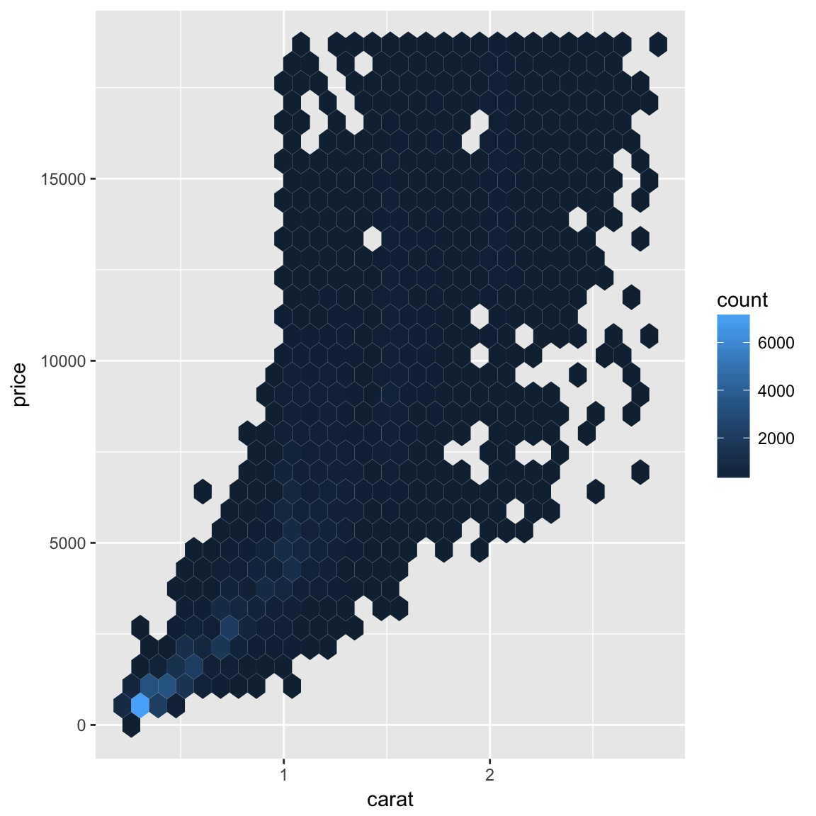 geom_bin2d() and geom_hex() divide the coordinate plane into 2d bins and then use a fill color to display how many points fall into each bin. geom_bin2d() creates rectangular bins. geom_hex() creates hexagonal bins. You will need to install the hexbin package to use geom_hex().