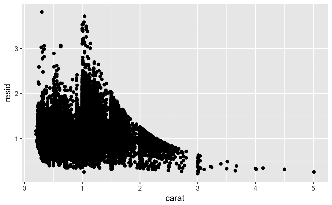 Models are a tool for extracting patterns out of data. For example, consider the diamonds data. It’s hard to understand the relationship between cut and price, because cut and carat, and carat and price are tightly related. It’s possible to use a model to remove the very strong relationship between price and carat so we can explore the subtleties that remain. The following code fits a model that predicts price from carat and then computes the residuals (the difference between the predicted value and the actual value). The residuals give us a view of the price of the diamond, once the effect of carat has been removed.