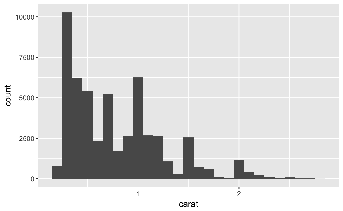 #> # ... with 5 more rowsA histogram divides the x-axis into equally spaced bins and then uses the height of a bar to display the number of observations that fall in each bin. In the graph above, the tallest bar shows that almost 30,000 observations have a carat value between 0.25 and 0.75, which are the left and right edges of the bar.