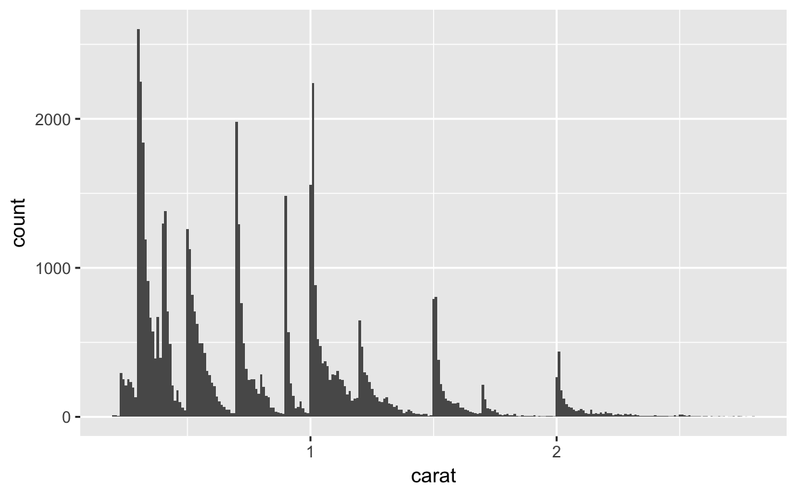 You can set the width of the intervals in a histogram with the binwidth argument, which is measured in the units of the x variable. You should always explore a variety of binwidths when working with histograms, as different binwidths can reveal different patterns. For example, here is how the graph above looks when we zoom into just the diamonds with a size of less than three carats and choose a smaller binwidth.
